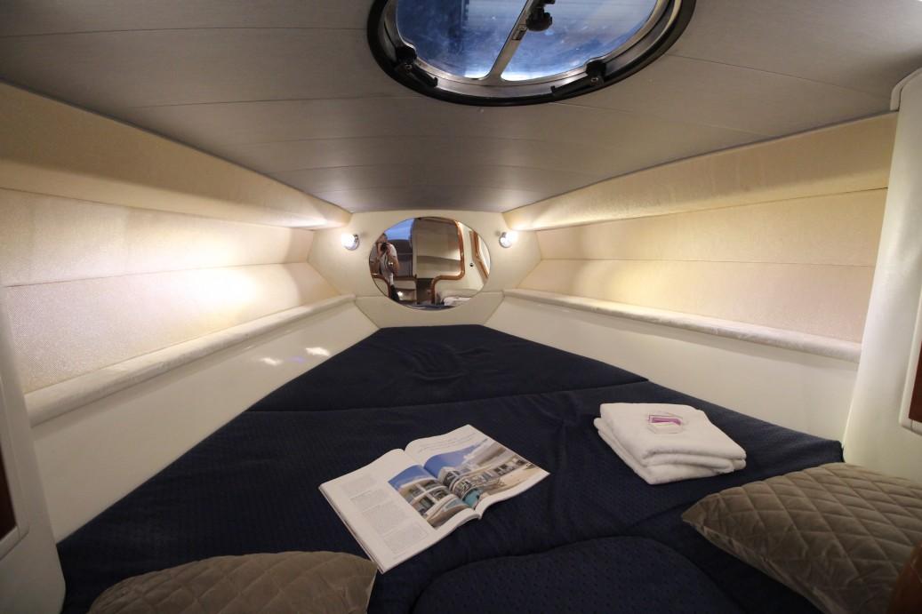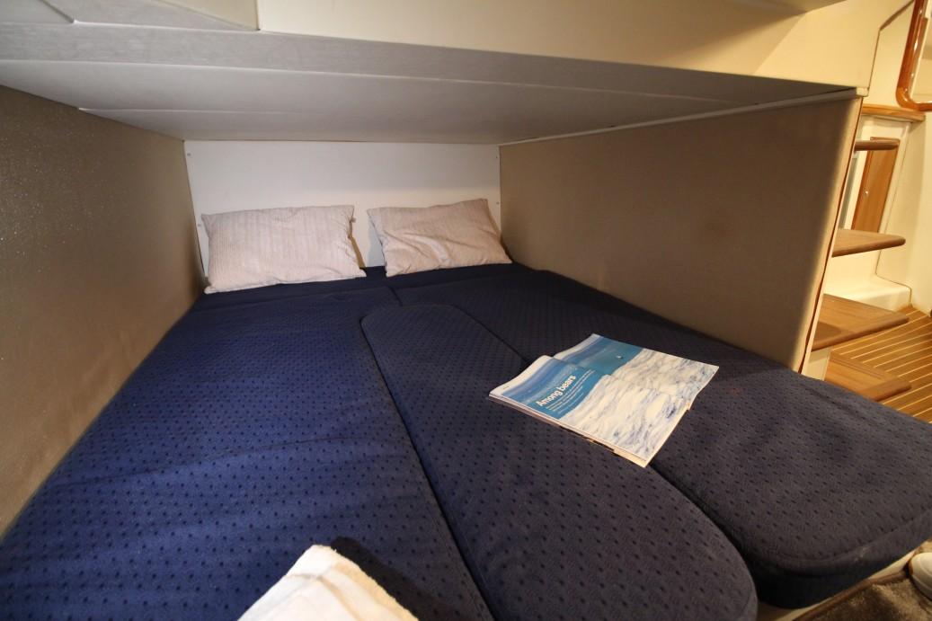 The owners cabin is placed traditional wise in her bow and has a good sized double berth that is accessible from the front. Multiple storage lockers left and right of the berth.