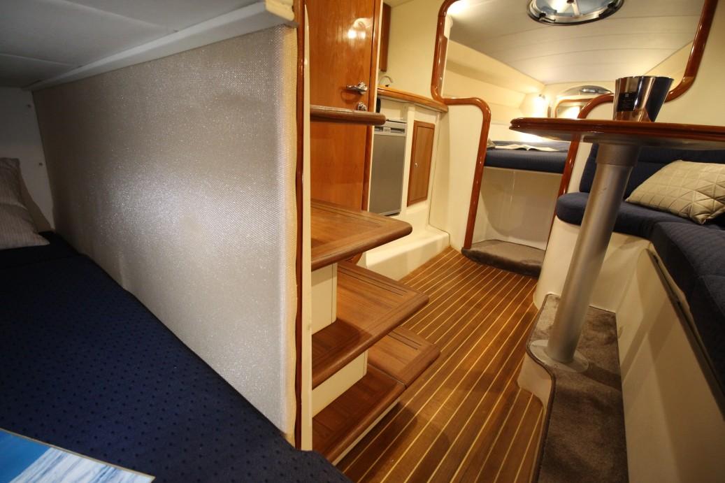 The guest cabin is situated under the cockpit over the entire beam. Just 4 steps down from her cockpit the comfortable guest cabin.