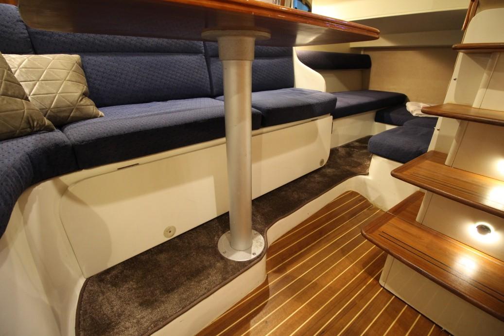 A helm seat with good 360 degree view up front and behind a full beam U-shaped seating area where you can sit with at least 8 guests in comfort. The fully hydraulic adjustable cockpit table can be positioned in any desired height with the touch of a button and thus ensures pleasant dining with a fully opened table at dining height or you just set it lower for usage as a lounge bar cocktail table.