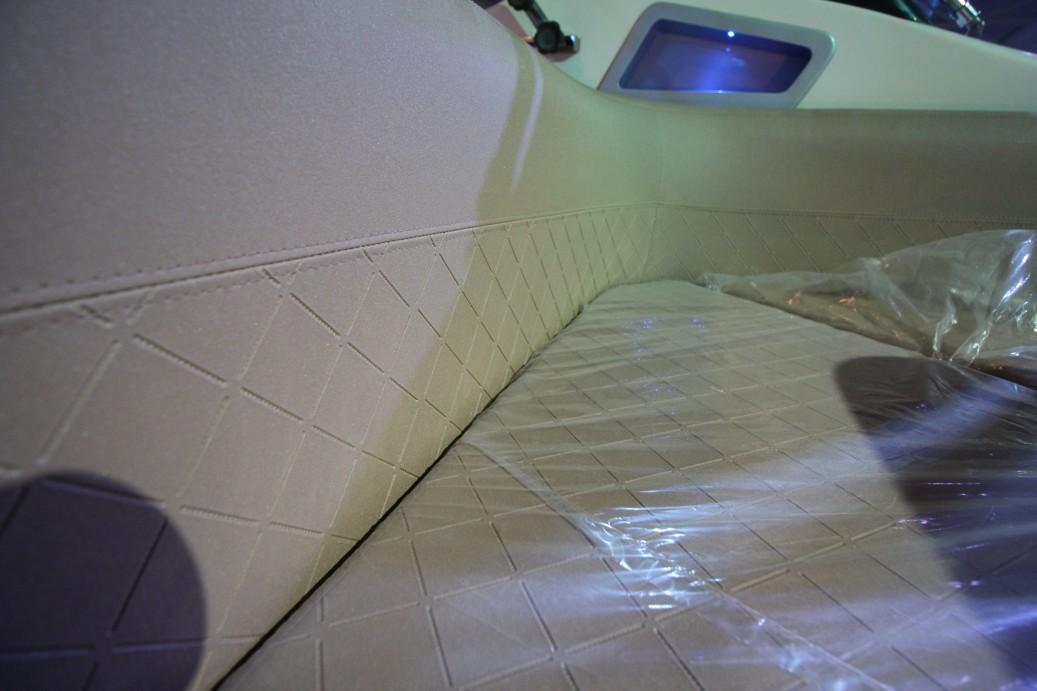 This saloon looks great, modern materials like alcantara and golden fabrics to create an interior that matches todays standard. Spacious wise it feels like a 40 or more footer boat.
