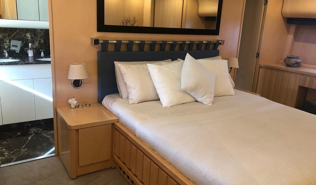 Équipé de deux moteurs MTU de 2000 CV, il atteint une vitesse de pointe de 30 nœuds. Les équipements de navigation incluent radar, GPS et pilote automatique. Le pont principal est doté d’un plan ouvert Sideck et le salon propose une disposition polyvalente avec toit rétractable. Le yacht dispose de cinq cabines, pouvant accueillir jusqu’à 11 personnes, incluant une suite propriétaire full beam avec lit king-size, coiffeuse, sofa et garde-robe, ainsi qu’une grande zone de bain de soleil et un coin salon à l’arrière et un spacieux sunpad à l’avant. L’espace pour l’équipage est aménagé pour trois personnes et la cuisine est bien équipée, avec un réfrigérateur neuf. Il comprend également un vaste garage, un tender, des enceintes Void, de puissants amplificateurs et une connexion pour table de mixage DJ.