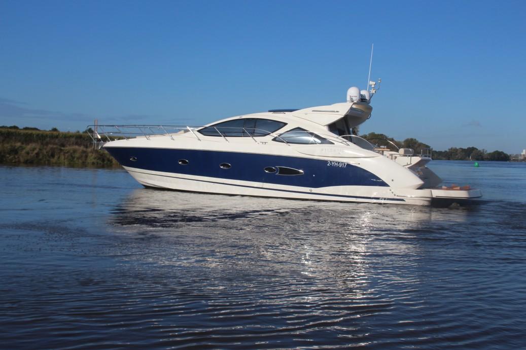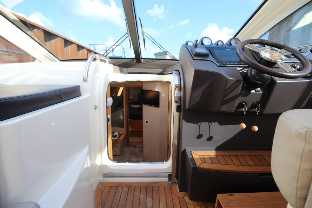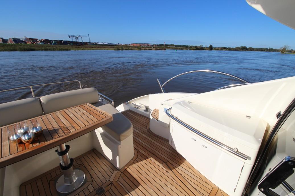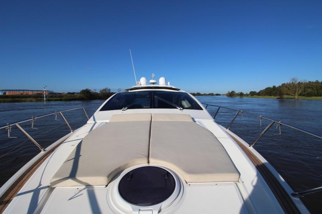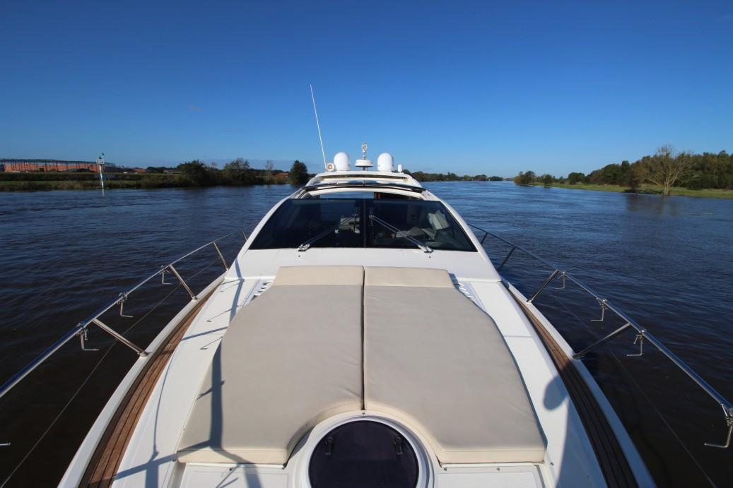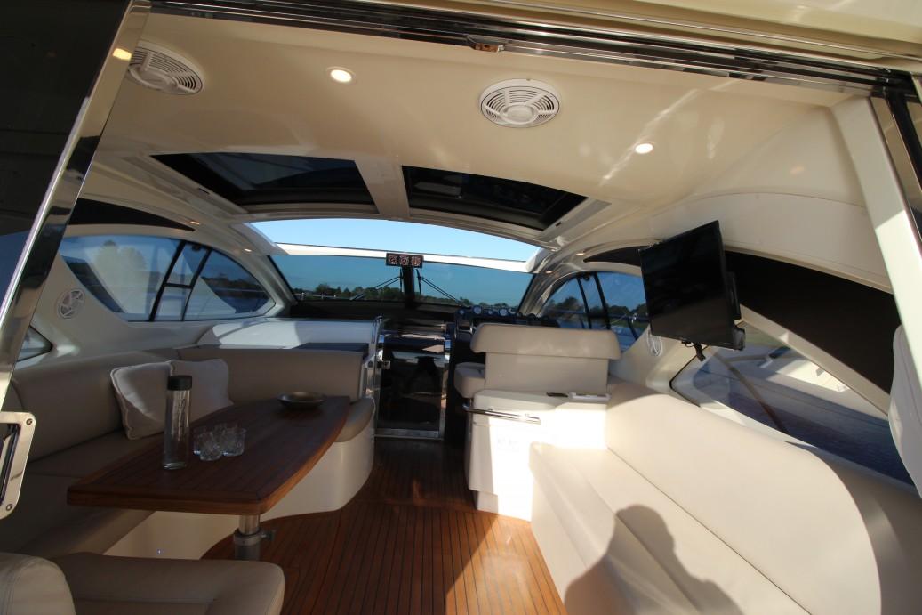 On deck, the layout remains practical and luxurious, featuring a large sunbathing area at the bow, a comfortable aft lounge, and a retractable hardtop sunroof for flexibility in varying weather conditions. The hydraulic swim platform, a signature feature of the Atlantis range, facilitates easy access to the water for swimming and watersports.