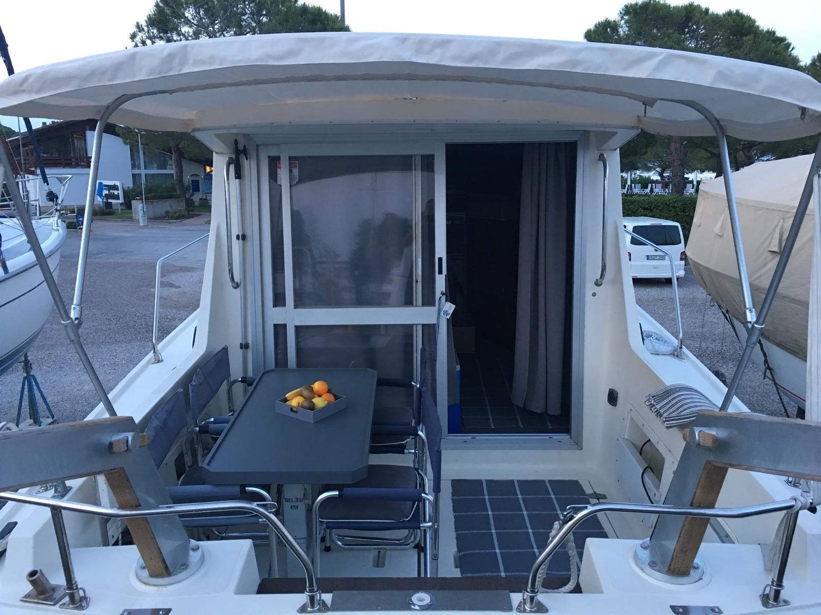 Motor Alarm, Alternator, Waterdruk systeem, Walstroomkabel, Buitendouche, Kraan voor bijboot (BESENZONI), Anker (ketting) spoelsysteem, Zonnepanelen, Stootwillen, Loopplank, Platform, Automatische bilgepomp, Walaansluiting 230V, Elektrische ankerlier, Zwemtrap, Kuiptafel, Bijboot (ZAR).
