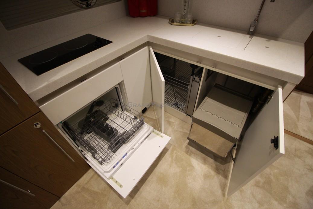 The galley is centrally located in the accommodations deck and is well laid out, and even has some innovations. Under the sink are the trash bins (double) which shows Beneteau's thoughts on recycling. Just to the left is a clever storage area that consists of wire shelving. When you pull one out, another falls into place, in effect doubling your storage capacity.