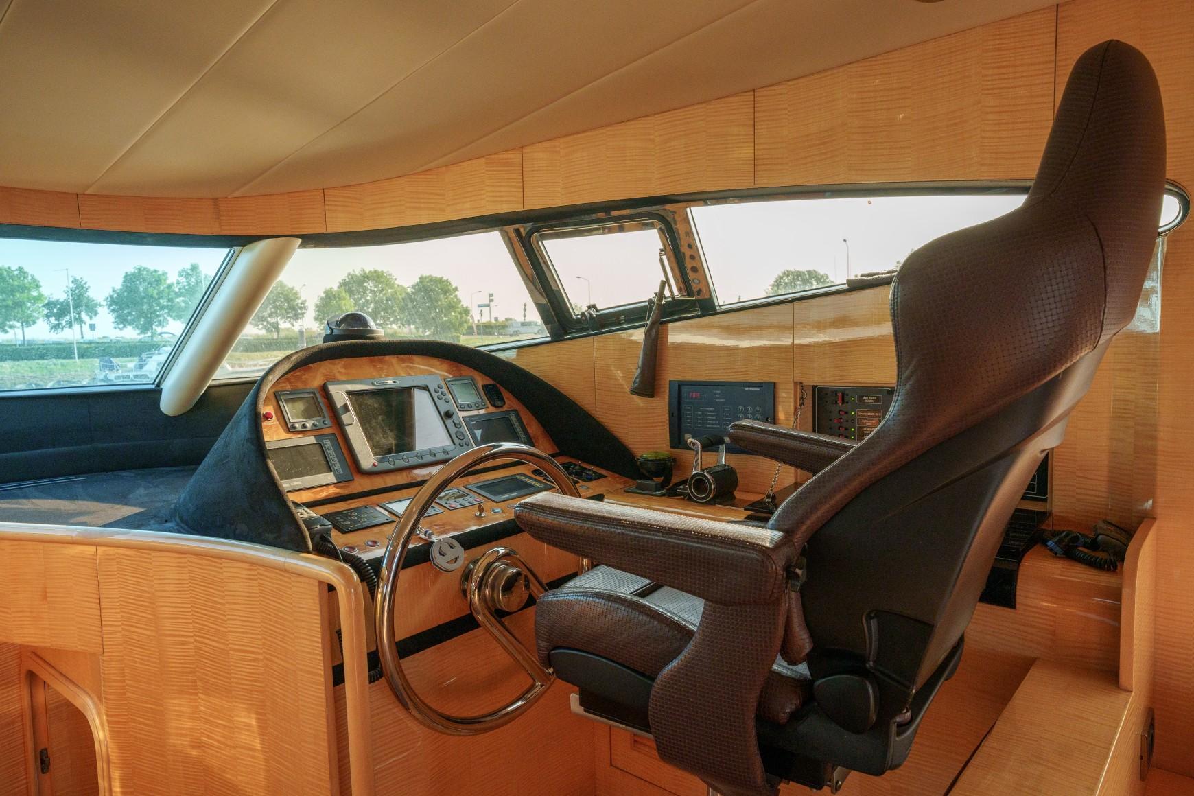 A cocktail bar area has been carved out at the back of the fly, equipped with a refrigerator and grill, to enjoy a totally relaxing and refreshing drink. The yacht also provides an enormous swim platform and a very powerful swivel crane that is used for boarding and lunching a large tender. The cockpit was designed to house a large rectangular table, providing room for 6-8 guests. From the cockpit we enter the large salon, which offers a pleasant area for conversation with a comfortable sofa. The spacious galley is located only two steps down from the salon floor near the main entrance.