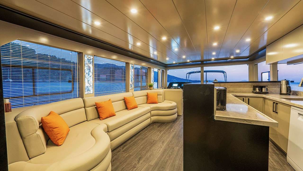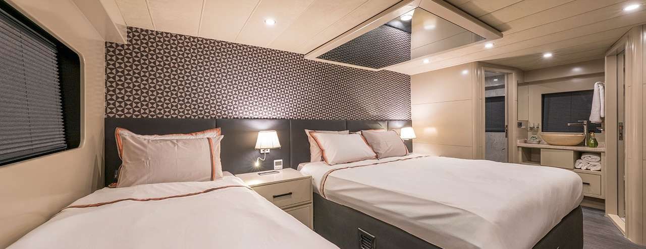 Perfectamente adaptado para una actividad charter, ofrece amplios volúmenes, una circulación fluida entre los espacios y un equipamiento completo que responde a las exigencias tanto de una explotación profesional como de un uso privado.