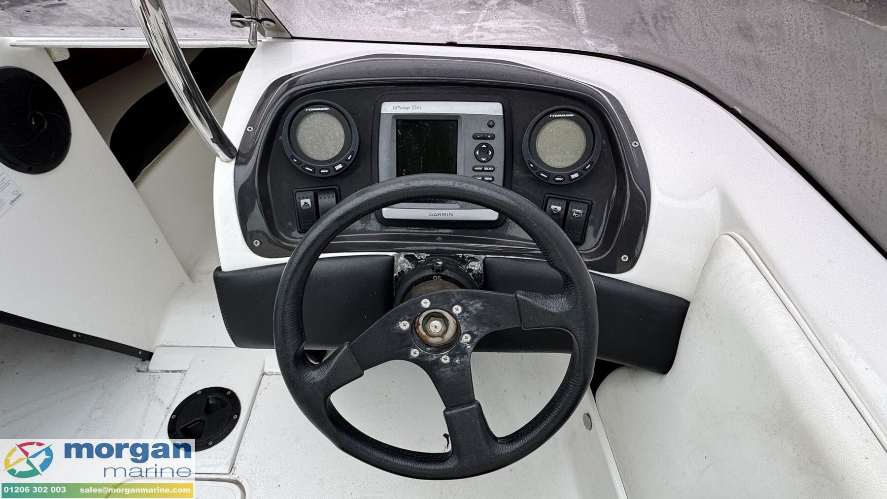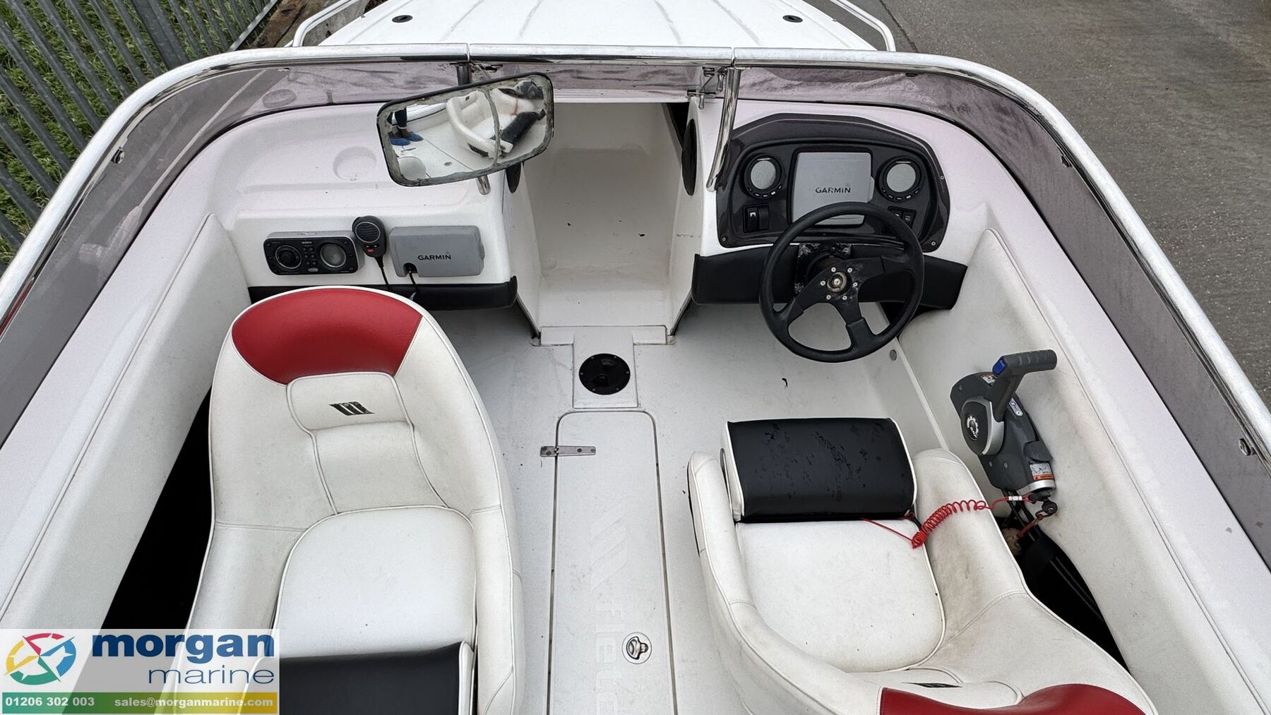 Cockpit: Helm and co-pilot swivel bucket seats + aft cushioned bench seat with backrest and lift up storage. Cooney stainless steel walk through windscreen with integrated grab handles to open bow with U - shape seating. Helm position with steering wheel, and engine controls. Mirror. Cup holders. Centre draining ski locker.