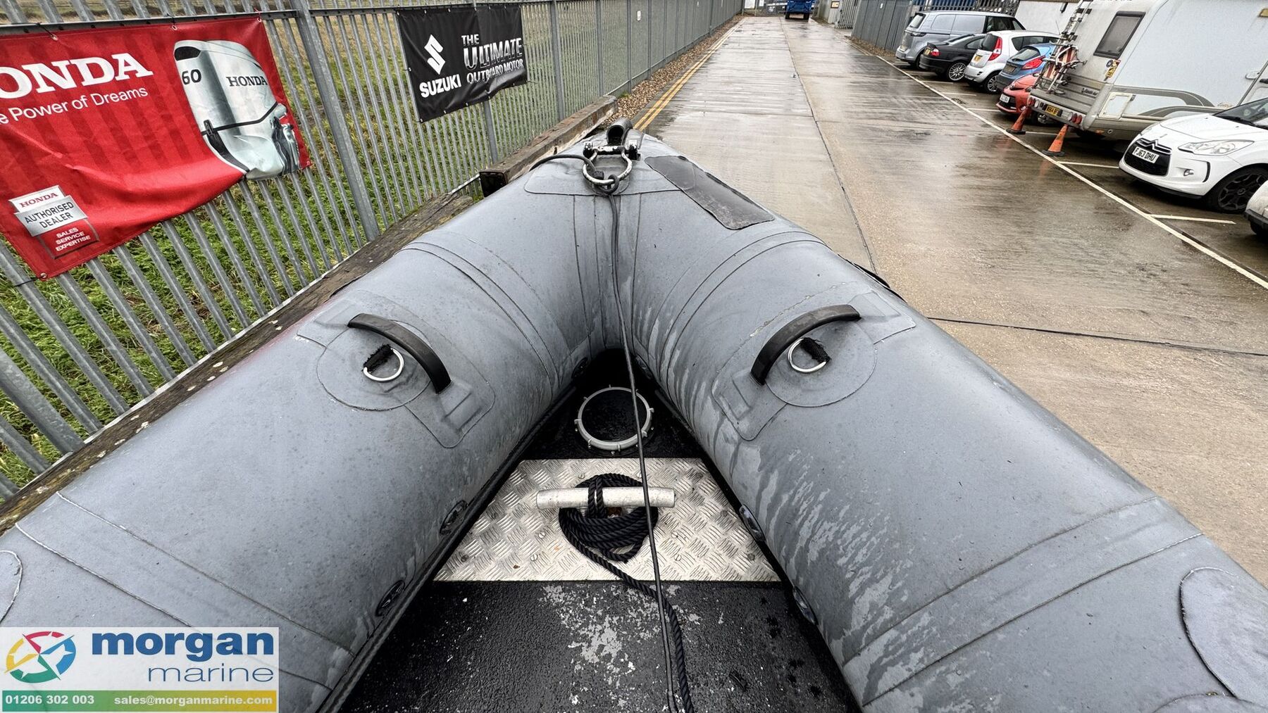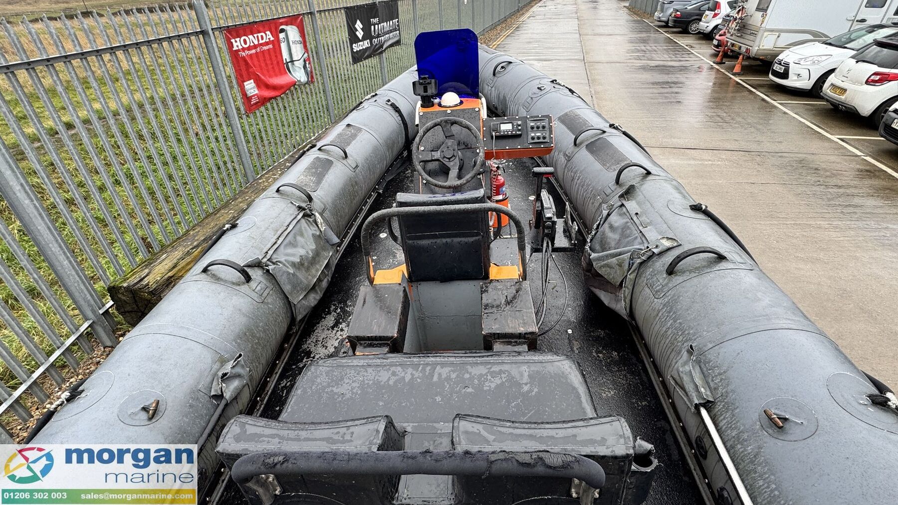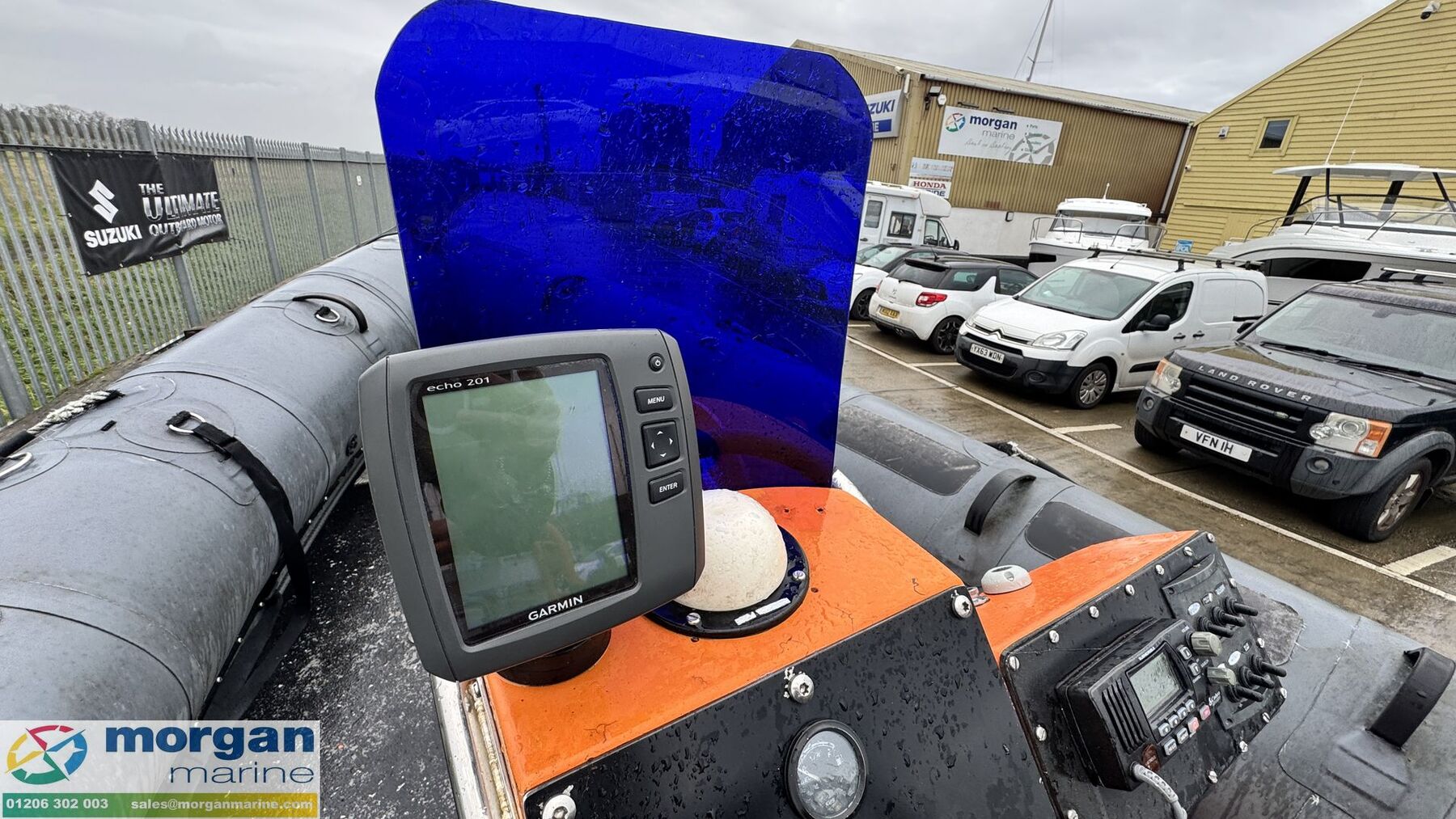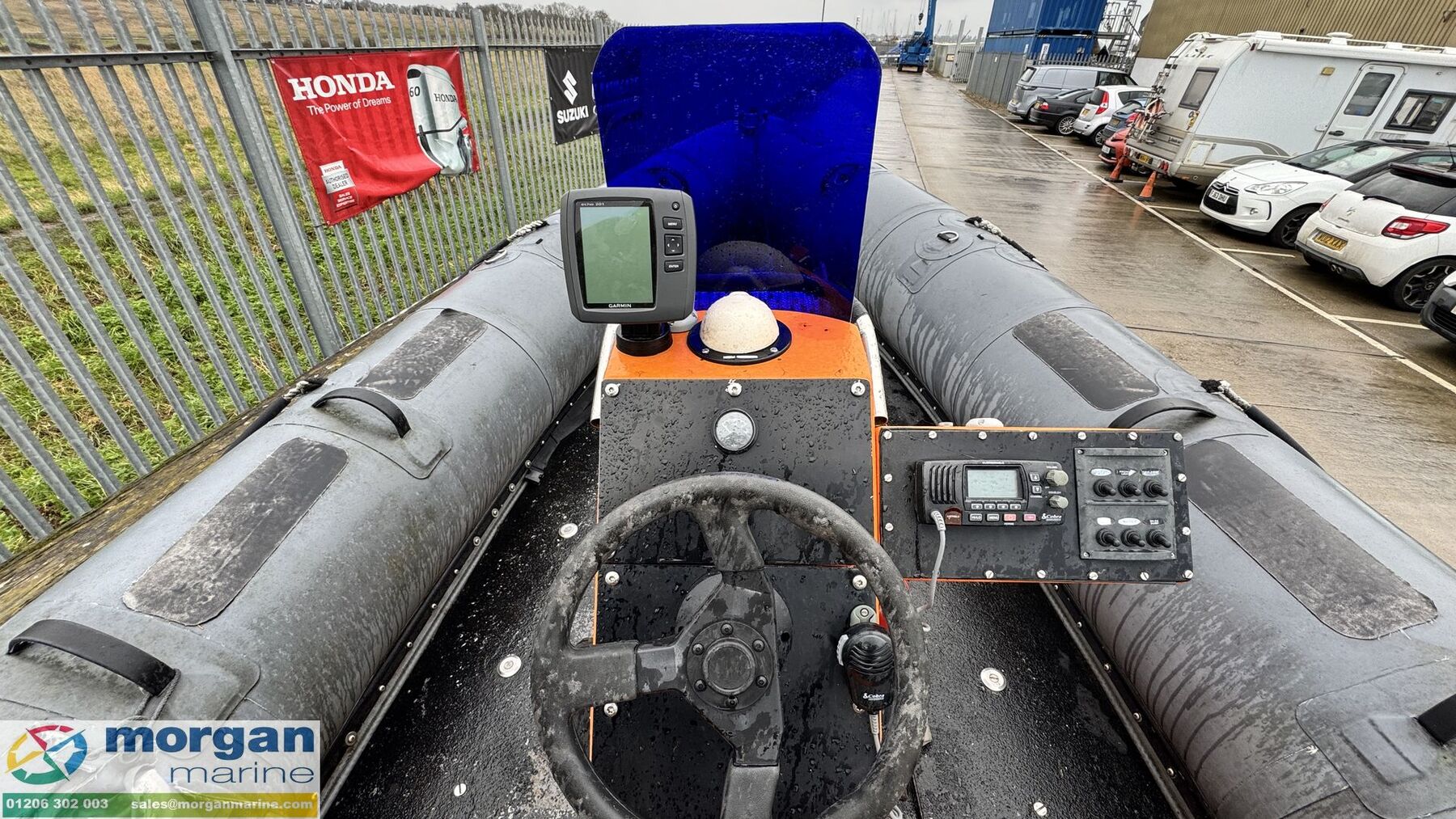Deck: GRP orange hull with grey Hypalon tubes. Mooring cleats. Rope handles. Grab handles. A-frame. Manual windlass with anchor, chain and rope on front of console. Oars. Fishing rod holders.