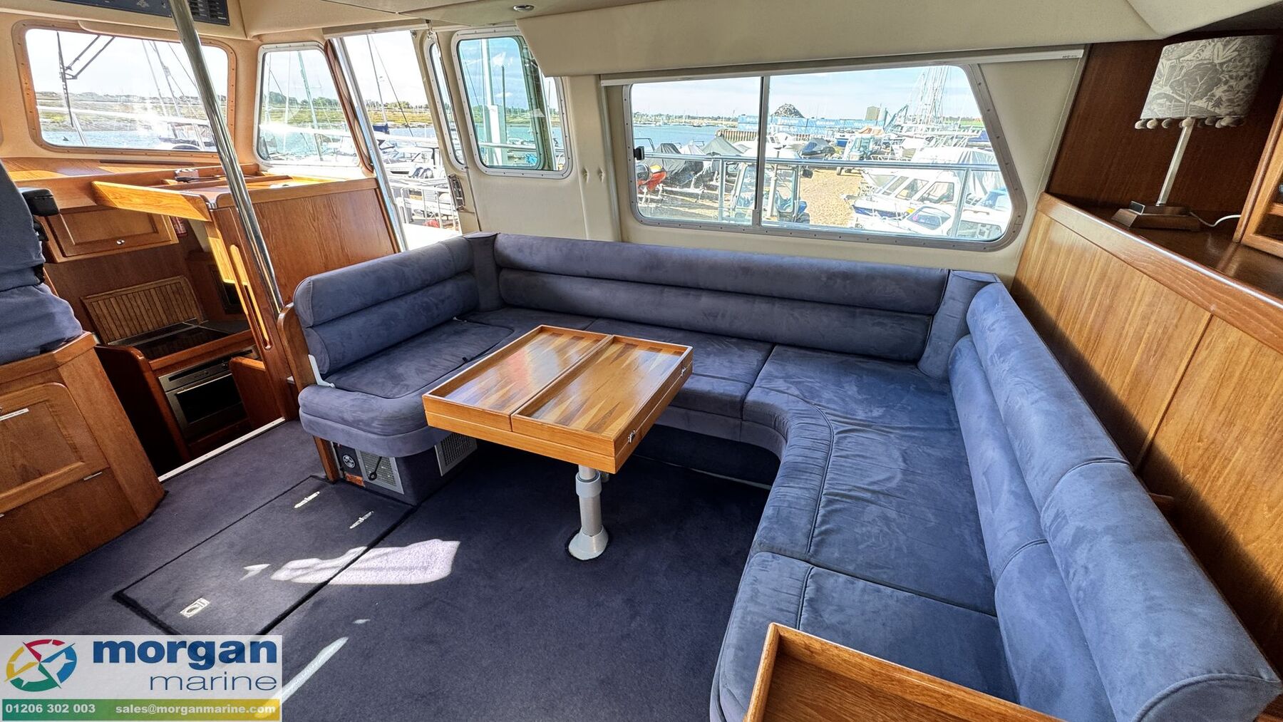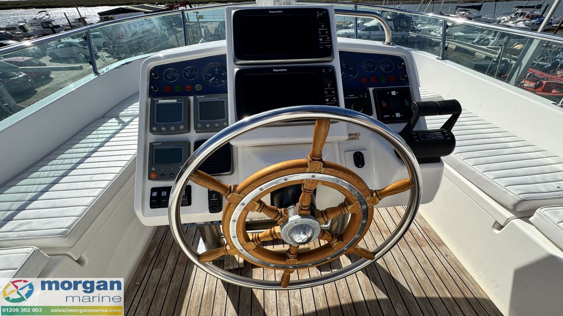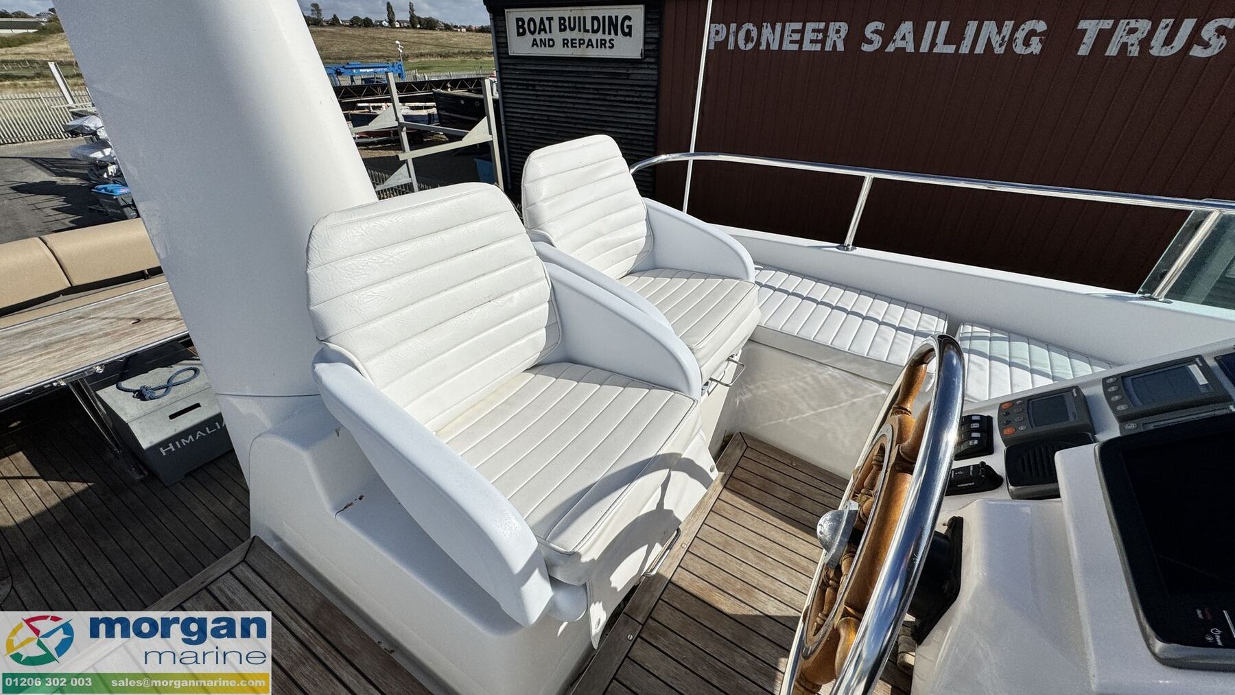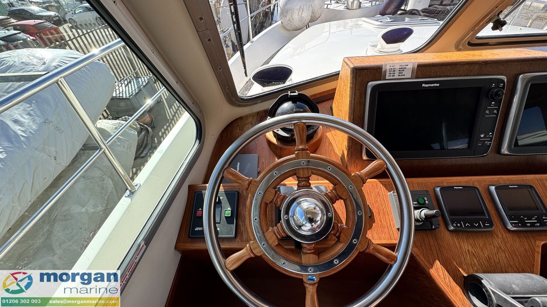 Cockpit: Walkaround teak laid side decks, aft coach roof and flybridge. Wheelhouse and flybridge steering and engine controls. Adjustable, sprung pilot and co pilot seat in wheelhouse. Pull up seat from saloon becoming a forward facing co pilot bench seat. Electric windscreen wipers with screen wash and electric demisters on front windscreen. Flybridge U-shaped cushioned seating with backrest. Pilot and co-pilot seating with engine dash display, steering wheel and engine controls. Flybridge stainless steel hand rails. 2nd aft cockpit seating with teak flooring, U-shaped bench style seating with storage and table.