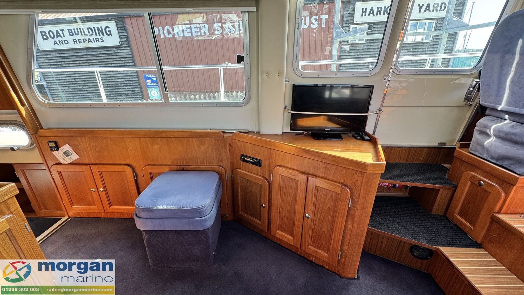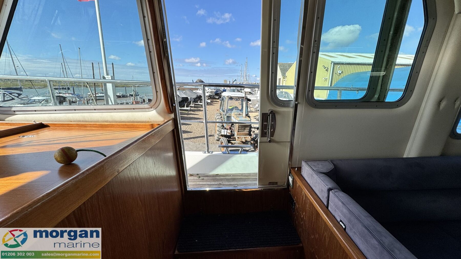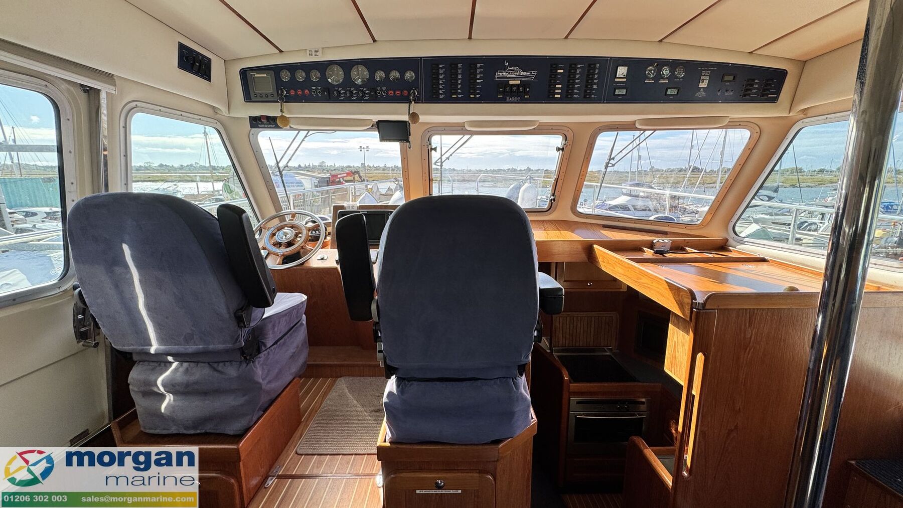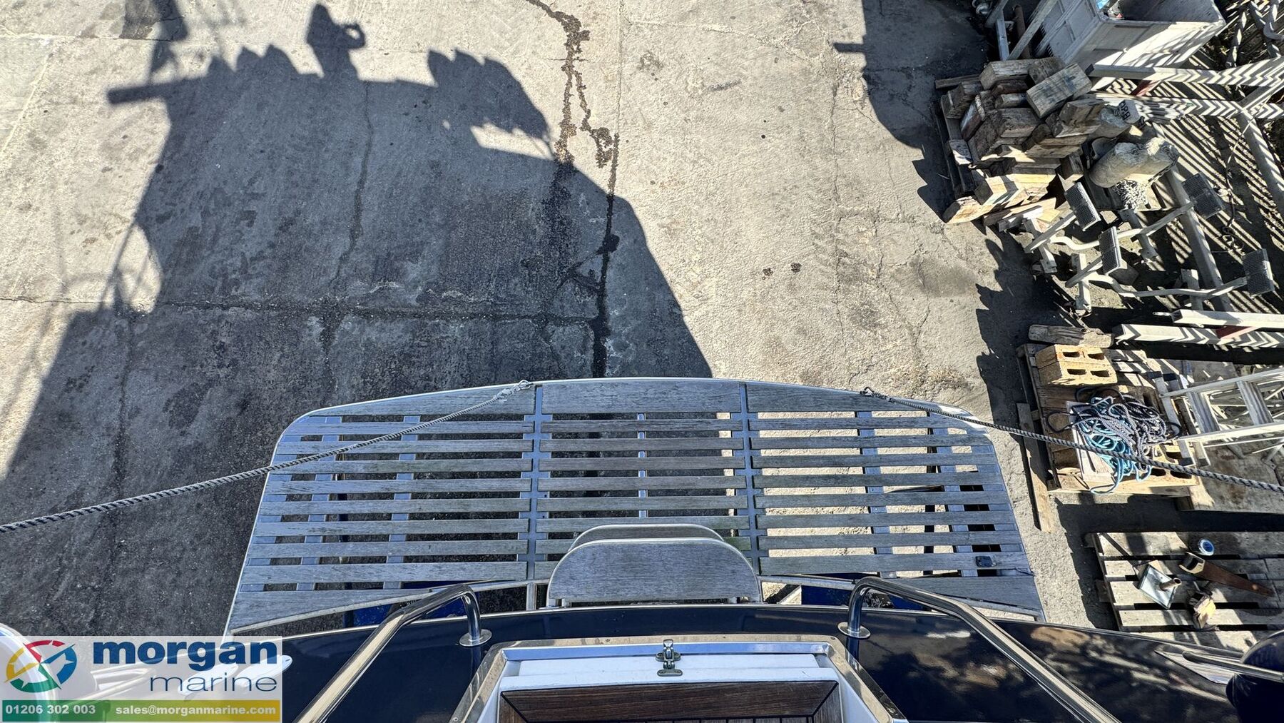 Cockpit: Walkaround teak laid side decks, aft coach roof and flybridge. Wheelhouse and flybridge steering and engine controls. Adjustable, sprung pilot and co pilot seat in wheelhouse. Pull up seat from saloon becoming a forward facing co pilot bench seat. Electric windscreen wipers with screen wash and electric demisters on front windscreen. Flybridge U-shaped cushioned seating with backrest. Pilot and co-pilot seating with engine dash display, steering wheel and engine controls. Flybridge stainless steel hand rails. 2nd aft cockpit seating with teak flooring, U-shaped bench style seating with storage and table.