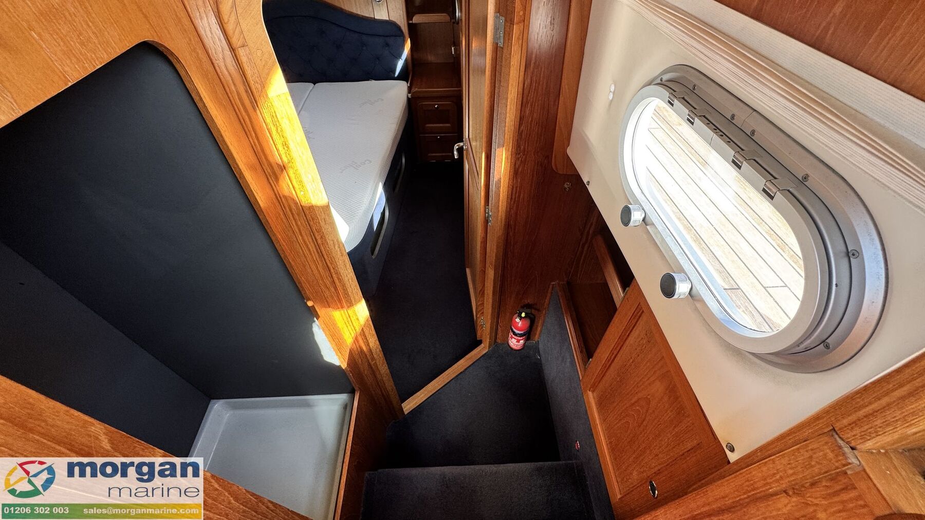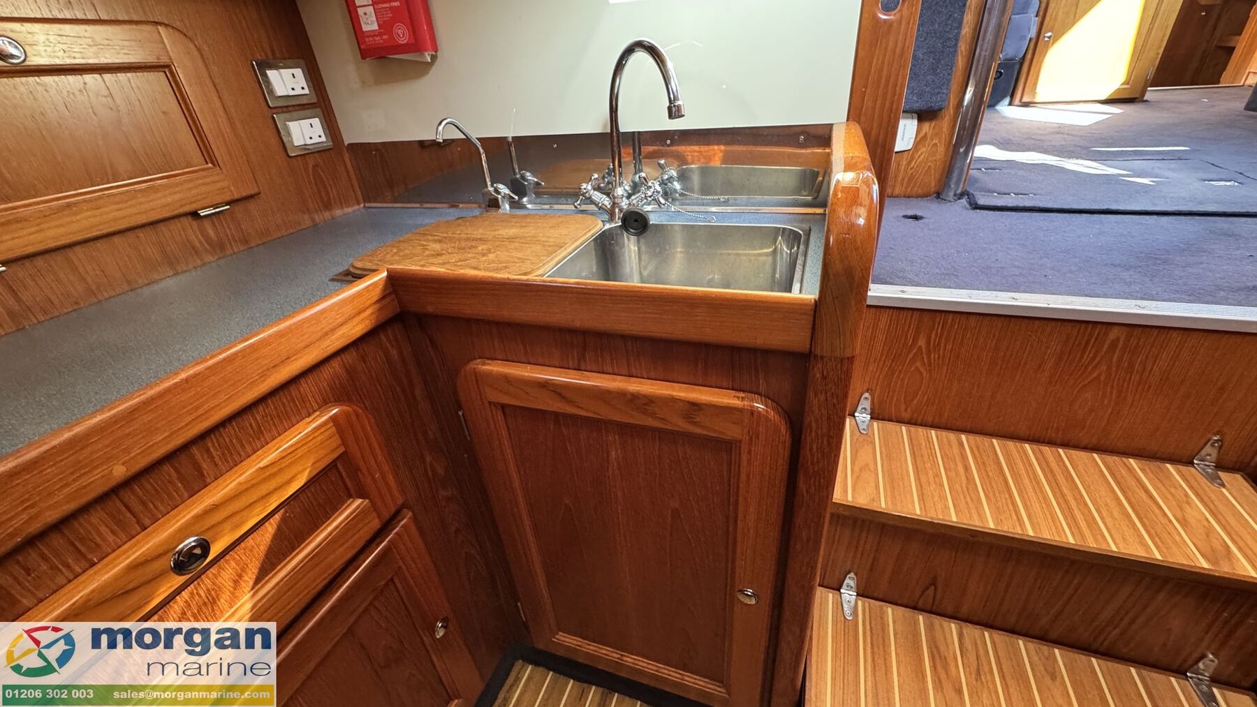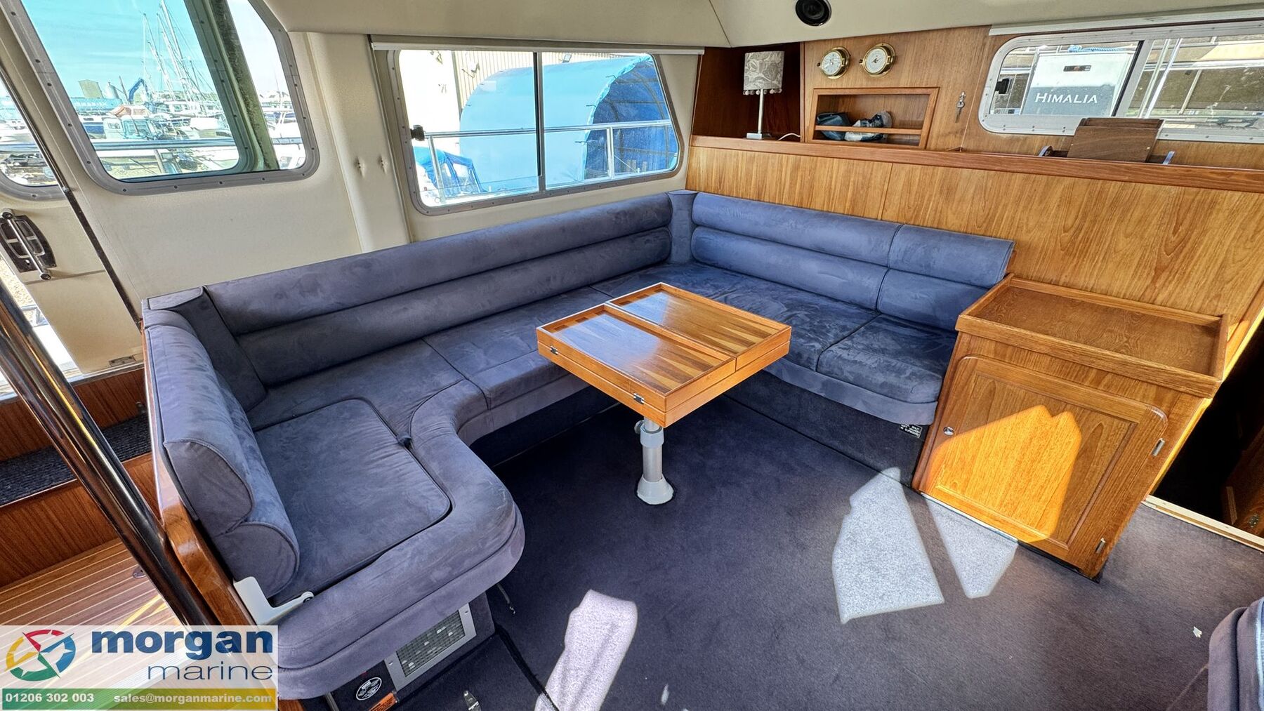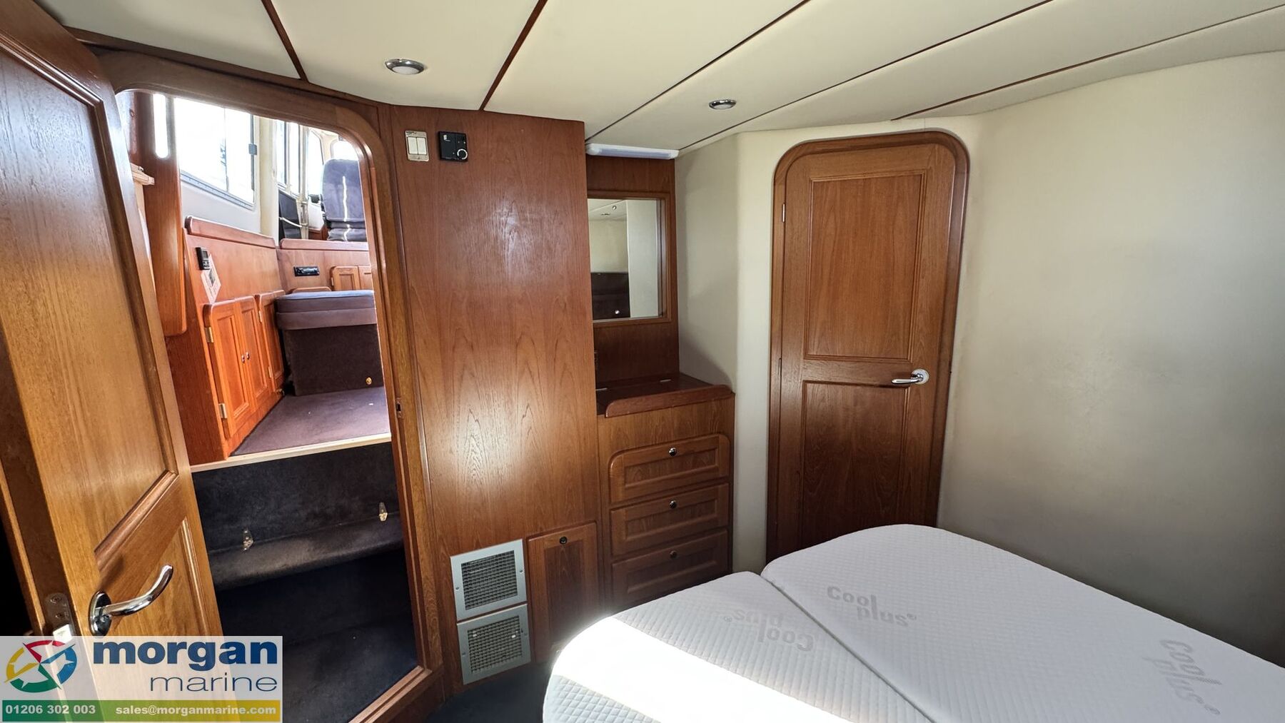 Cockpit: Walkaround teak laid side decks, aft coach roof and flybridge. Wheelhouse and flybridge steering and engine controls. Adjustable, sprung pilot and co pilot seat in wheelhouse. Pull up seat from saloon becoming a forward facing co pilot bench seat. Electric windscreen wipers with screen wash and electric demisters on front windscreen. Flybridge U-shaped cushioned seating with backrest. Pilot and co-pilot seating with engine dash display, steering wheel and engine controls. Flybridge stainless steel hand rails. 2nd aft cockpit seating with teak flooring, U-shaped bench style seating with storage and table.