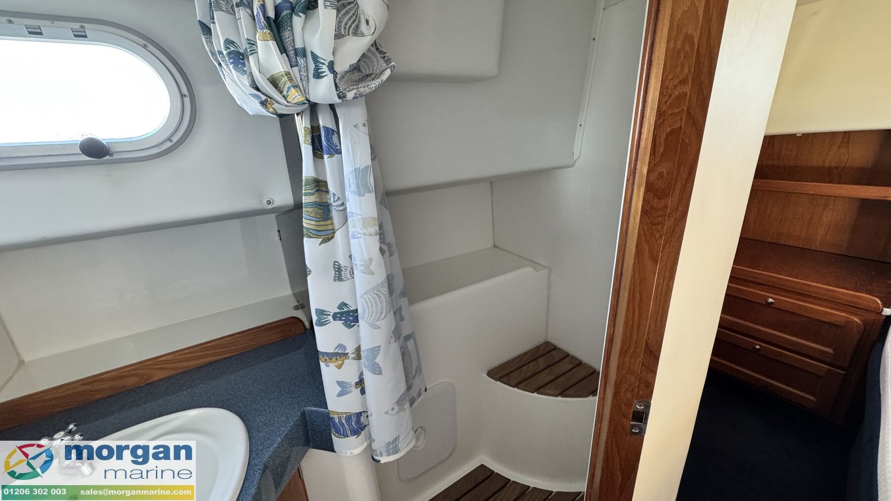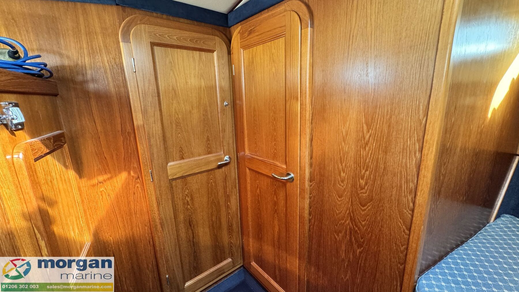 Cabin: Main master aft cabin with double berth, lots of storage and access to Ensuite toilet compartment with toilet, sink, shower, mirror and storage. Forward V-shaped double berth with infill cushion, storage, and roof hatch. Jack and Jill door to toilet compartment with toilet, sink, shower, mirror and storage. 3rd cabin with single berth, and storage. Large saloon U-shaped seating with table which owner has made custom made Backgammon game board on, TV and lots of storage. Extra fridge in saloon area. Galley with oven, hob, twin sink with hot and cold mixer tap, fridge, microwave and lots of storage. Overhead galley locker storage. Good amount of light from large windows.