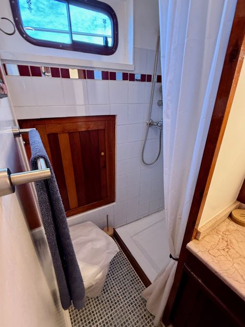 Originalmente llamado Buyuk Amiral, Pen Doar fue diseñado en 1988 por su primer armador para navegar hacia el Mar Rojo y el Océano Índico. Es un barco cómodo y muy marinero, capaz de soportar vientos de hasta 50 nudos — lo hemos comprobado en cinco ocasiones. Entre 2018 y 2023, se llevó a cabo un refit integral para hacerlo autónomo y listo para travesías transoceánicas.