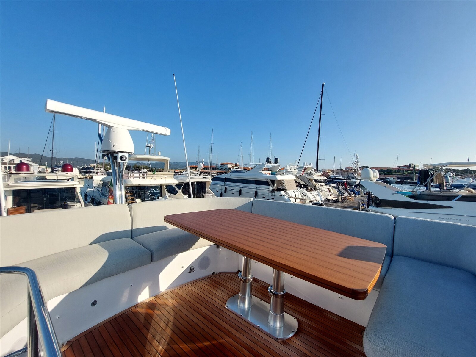 Bimini (Elettroidraulico sul fly), Polster (Batyline grey), Bugpolster, Verdunkelungsvorhänge, Persenning für Fenster, Flybridge Cover, Instrumenten Abdeckung, Sitz Abdeckung, Sonnenpersenning (Privacy di poppa), Mückennetz.