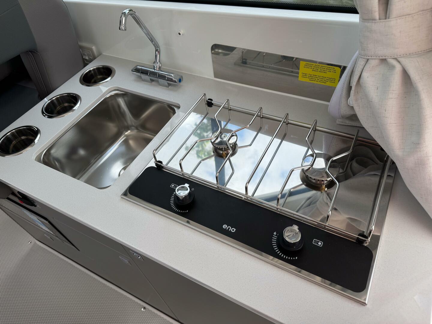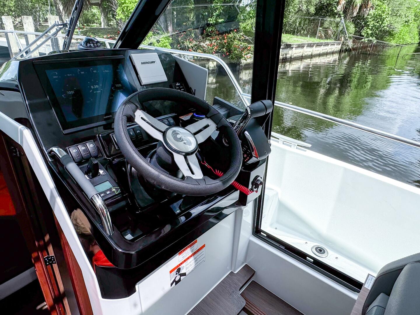 The helm includes, as standard, a captain’s chair with bolster function, panoramic windshield, steering compass, space to flush-mount electronics, and sliding side door for ventilation and easier docking.