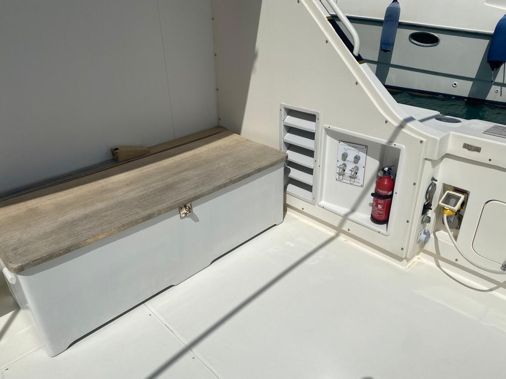 2 Motor Alarm, Bilge Alarm, Waterdruk systeem, Accu's (nuove 2021), Acculader (12 V e 24 V), Buitendouche, Zoeklicht geïnstalleerd op spiegel, Hydraulische trimflappen, Brandblussysteem (con controllo esterno), Anker (ketting) spoelsysteem, Sfeerverlichting, Loopplank (elettroidraulica), Platform, 3 Automatische bilgepomp, Ingangsdeur, Walaansluiting 230V, Walaansluiting voor water, City-/Water-connection, Gelijkrichter, Elektrische ankerlier, Zwemtrap, Hoorn, Boeglier.