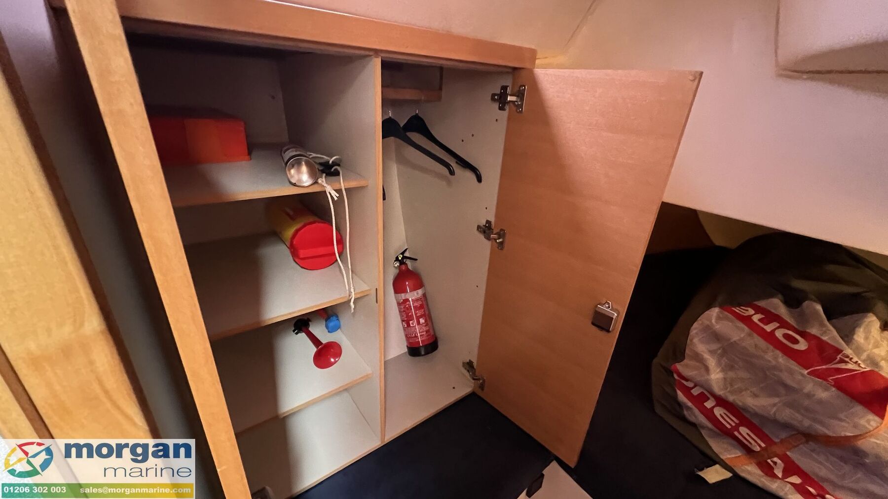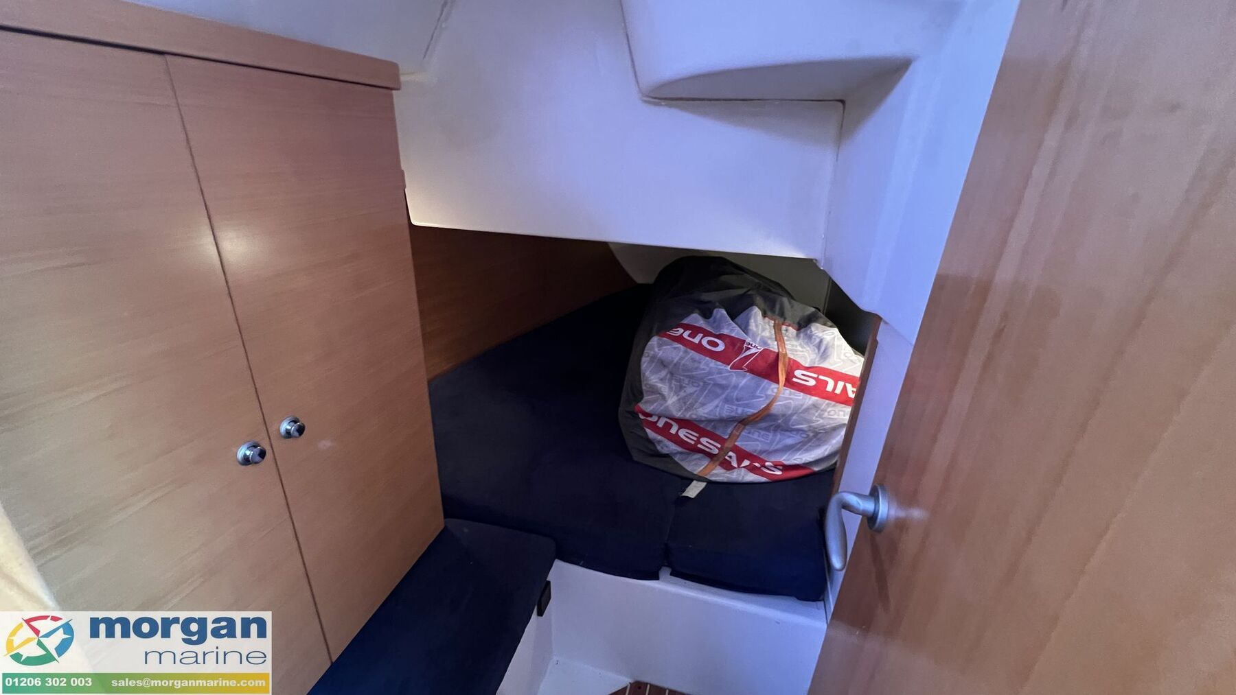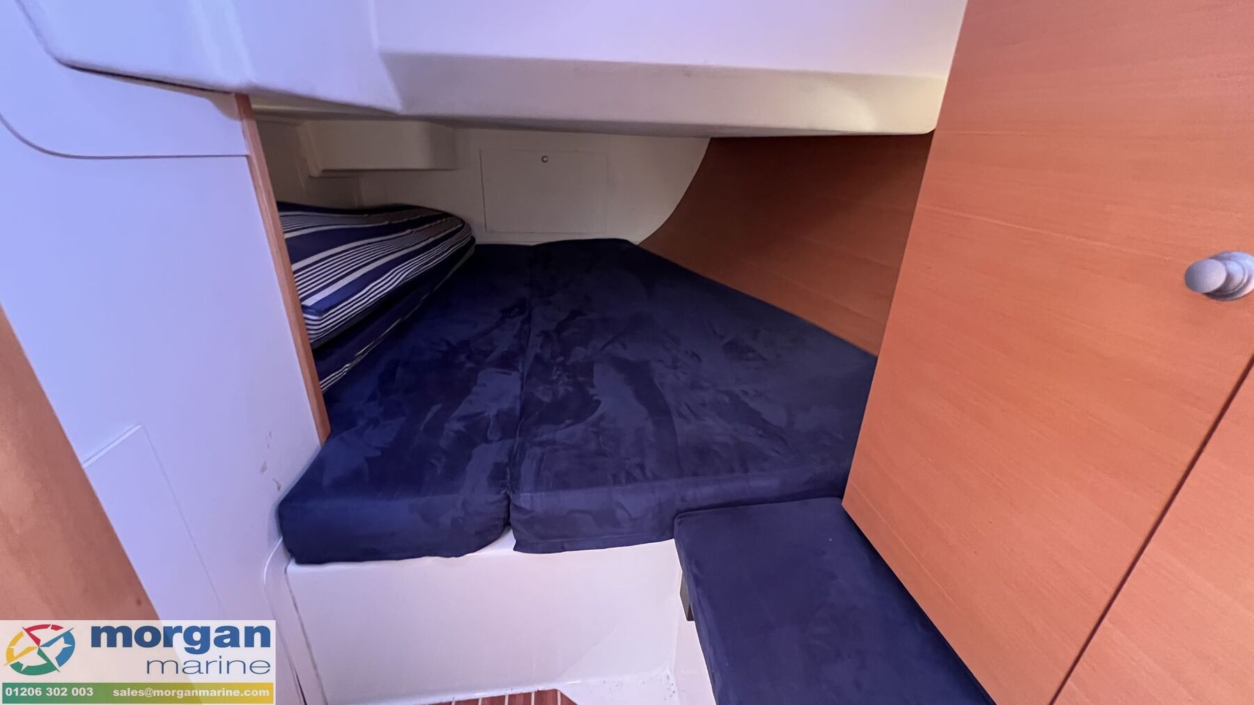 Cabin: Steps down into cabin area. U-shaped saloon setting with cushions and backrest. Saloon fold down table. TV in saloon area. Storage lockers in saloon. Galley area with 2x Stainless Steel sink, fridge, cool box, Dometic oven, gas stove, large worktop area, wine rack, wine glass holders and storage. Port side 2x person director chair seating with navigation table. Forward double berth cabin with good headroom, mattress, deck to hatch, and storage. Aft port and starboard double berths with mattress, wardrobes and storage. Forward head compartment with toilet, sink and storage. Aft head compartment with toilet, sink, storage and shower. Both hot and cold water. Both heads have holding tank. Interior lights. Barometer clock.