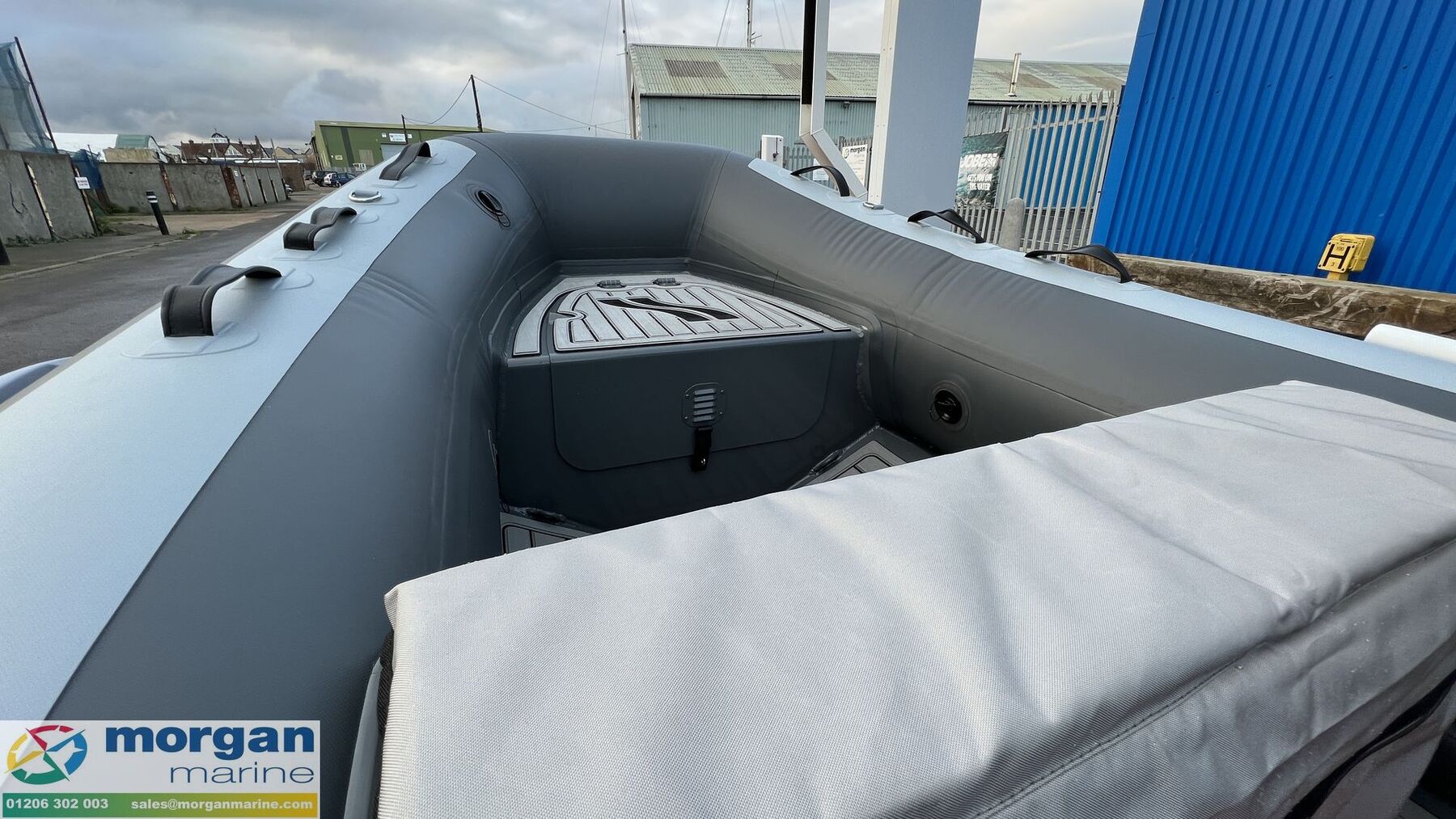 Deck: Dark grey PVC tubes 44cm diameter. Self-draining deck. Welded seams. Flush mount non return valves. High tensile chromated & powder coated aluminium hull. Bow locker (Fit 24L fuel tank). Integrated transom supports. Floating console with 2 person bench seat + backrest. Removable seat. Lifting points and towing eyes. Tow bridle points. Brushed foam teak finish deck. Heavy duty rubbing strake and full length keel guard.