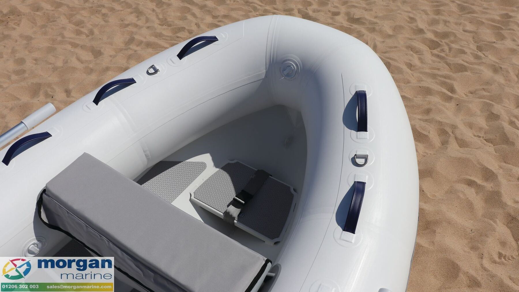 Deck: Light grey PVC Mehler Tube: 38cm diameter. Welded seams. Flush mount non-return valves. High tensile chromated and power coated aluminium hull. Self-draining deck. Removable seat. Lifting points and towing eye. Tow brindle points. Anti-slip deck. Light weight rubbing strake and full length keel guard.