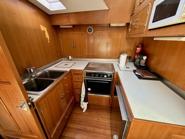 Fully equipped galley with double sink, oven, microwave and refrigerator