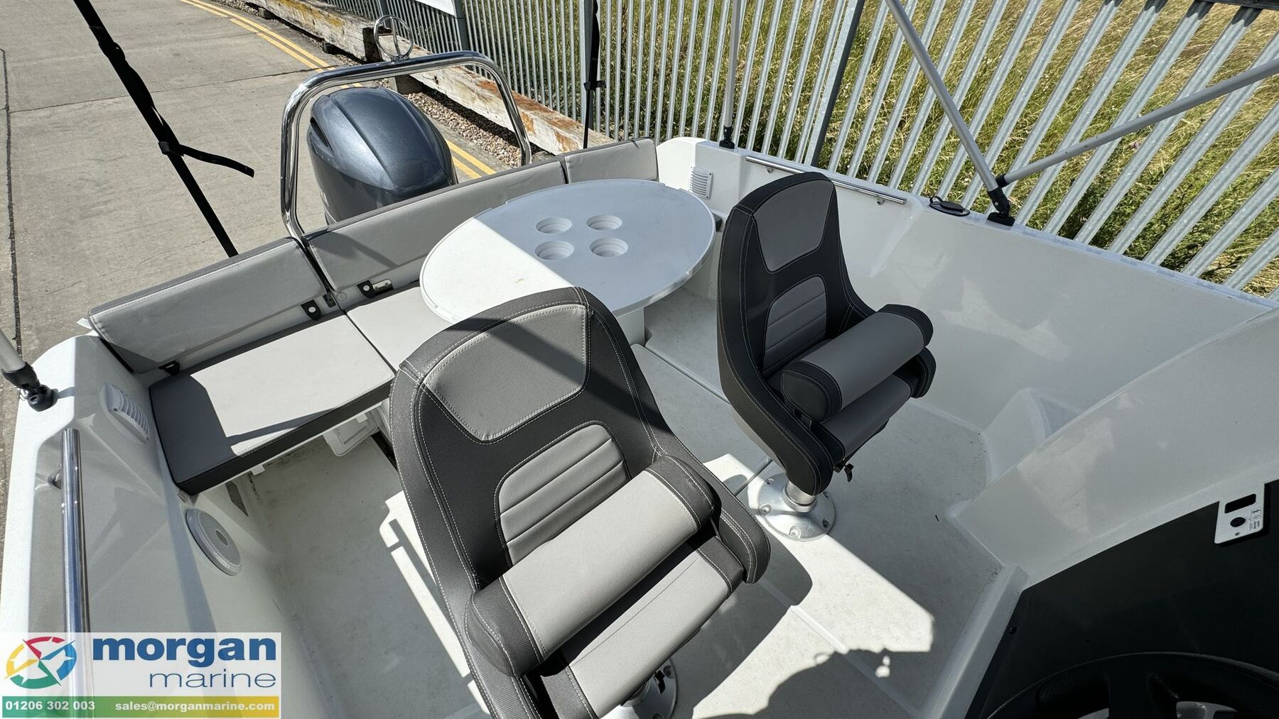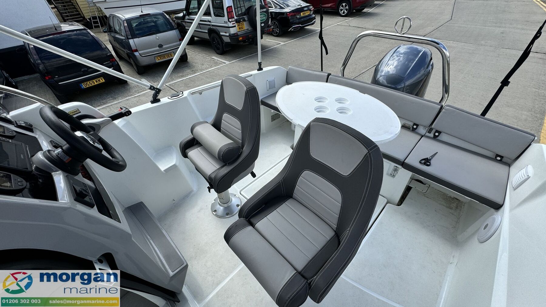 Cockpit: Console with mini windscreen and handrail + steering wheel, engine controls and gauges. Pilot and co-pilot adjustable bolster seats. Aft sliding bench seat with removable cushions, backrest and table. Compass.