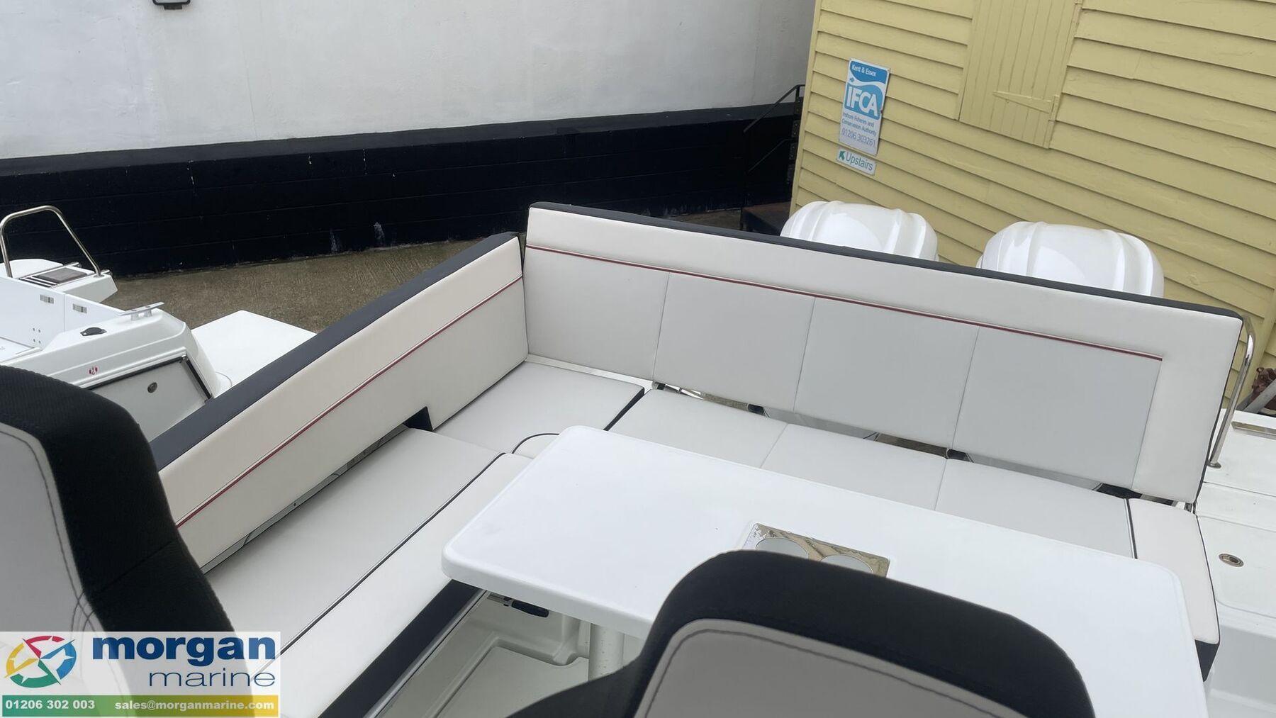 Cockpit: Cockpit galley leaning post with 49L fridge, storage and gas stove. Fibreglass hardtop: T-top with fibreglass roof with black aluminium legs and aft cockpit work light. Adjustable pilot and co-pilot large bolster seats. Helm position with dashboard, full engine controls, compass, and navigation + music electronics. Manual folding terrace with swim ladder for increased cockpit space and easy access to the water. Extended swim platforms + locker. Cockpit shower. Cup holders. Sink in cockpit. Cockpit upholstery - silvertex ice diamante carbon. Removable fibreglass table in cockpit.