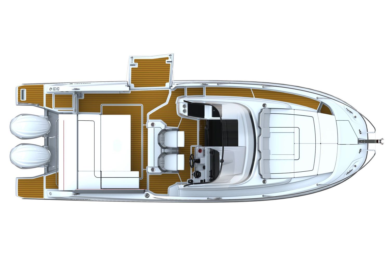Cockpit: Cockpit galley leaning post with 49L fridge, storage and gas stove. Fibreglass hardtop: T-top with fibreglass roof with black aluminium legs and aft cockpit work light. Adjustable pilot and co-pilot large bolster seats. Helm position with dashboard, full engine controls, compass, and navigation + music electronics. Manual folding terrace with swim ladder for increased cockpit space and easy access to the water. Extended swim platforms + locker. Cockpit shower. Cup holders. Sink in cockpit. Cockpit upholstery - silvertex ice diamante carbon. Removable fibreglass table in cockpit.
