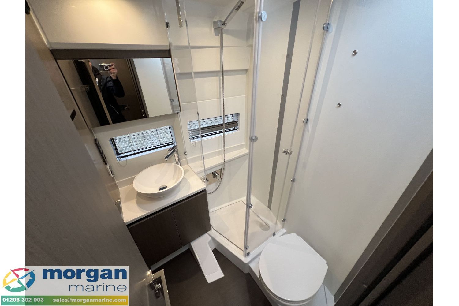 Cabin: Forward cabin with double berth (slatted base) + headband cushion, roof hatch, opening porthole, hull + deck windows, LED lights + reading lamps, wardrobe, shelves and lockers. 2nd cabin (port side) with 2x single berths, opening porthole, wardrobe and LED lights + reading lamps + removable carpet. 3rd cabin with 2x single berths, opening porthole, wardrobe, LED lights + reading lamps + removable carpet. Two toilet compartments - both with electric flush toilet, separate shower, washbasin and opening porthole.