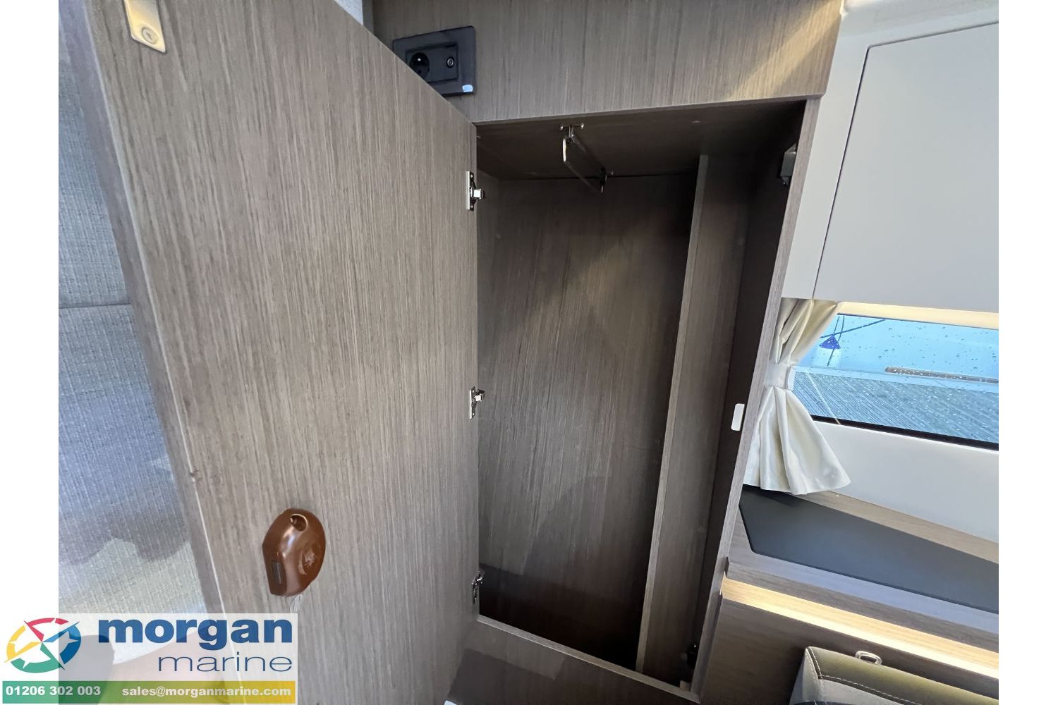 Cockpit: Wheelhouse with aft sliding door, starboard side sliding door, port side sliding window, front glass windscreen with port and starboard windscreen wipers + screen wash. Helm position with adjustable bolster bench. Wide and safe starboard side deck for easy access from aft to bow and to helm side door. Wheelhouse saloon on port side with U-shape seating (with lockers under) around table. Aft galley with sink (electric pressurised hot water), 144L fridge, microwave, gas stove, bar, storage and overhead lockers. Wheelhouse curtains + removable carpet. Leatherette tannery sugar upholstery in saloon.