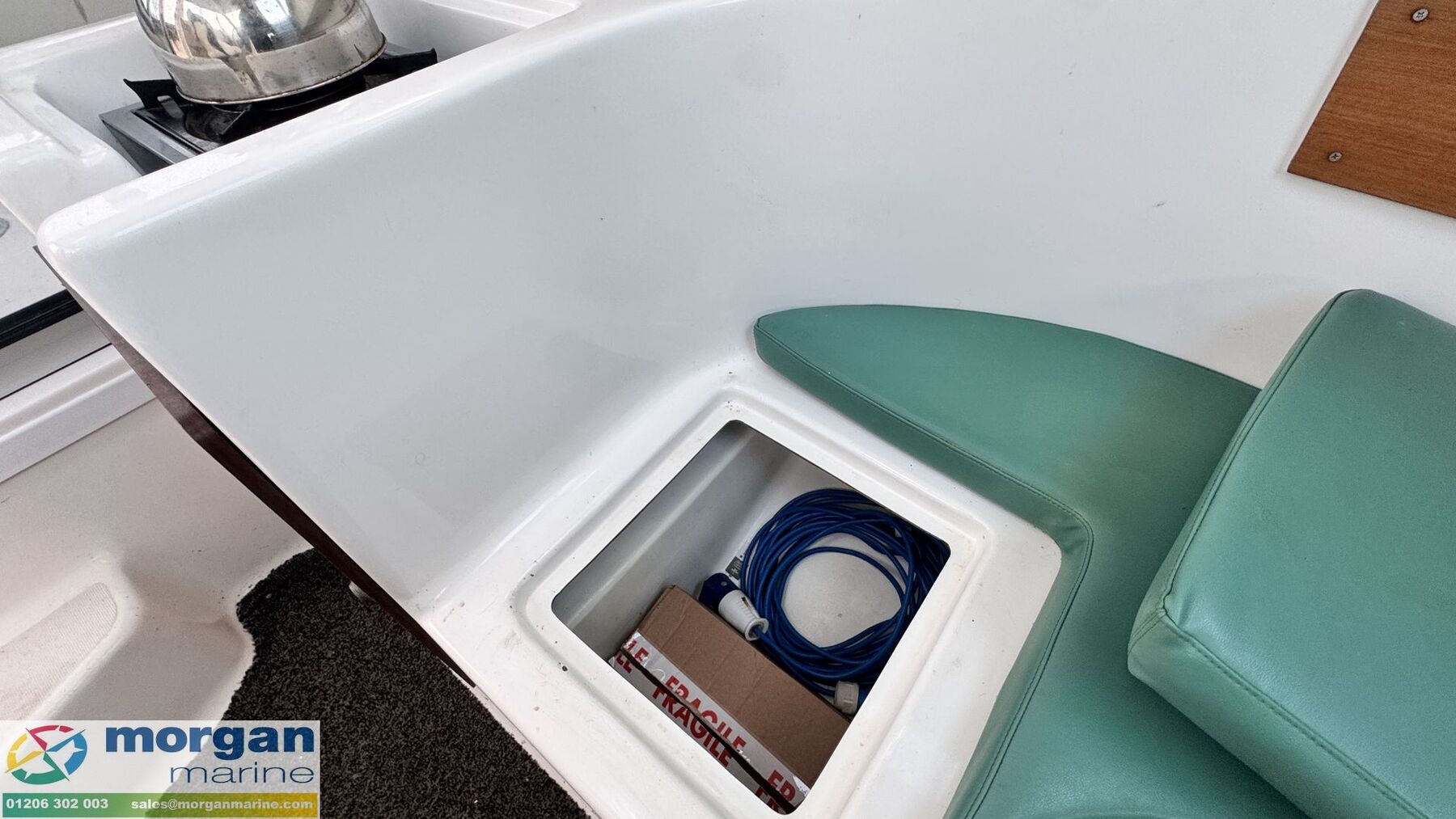 Cockpit: Large wheelhouse with pilot seat with dash and engine controls. Sliding aft door to wheelhouse. Roof hatch. Large windscreen with good visibility with 2x electric windscreen wipers. Port side galley with stove and storage. Starboard side sink. Lazarette deck locker. Large cockpit bench style fold up seating with removable cushion.
