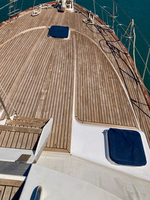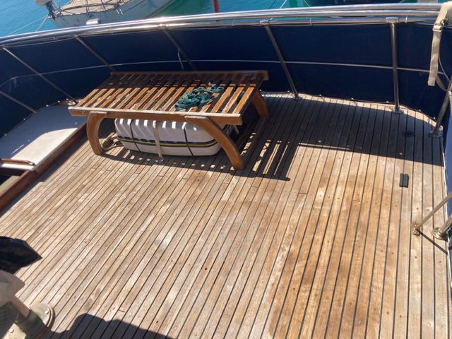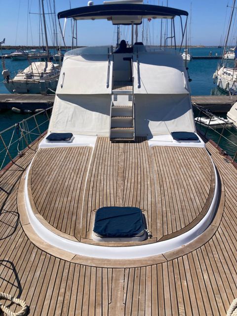 Electric windlass – Hydraulic gangway – Teak deck – Sun awning – Bimini – Water heater – Bow and stern thrusters