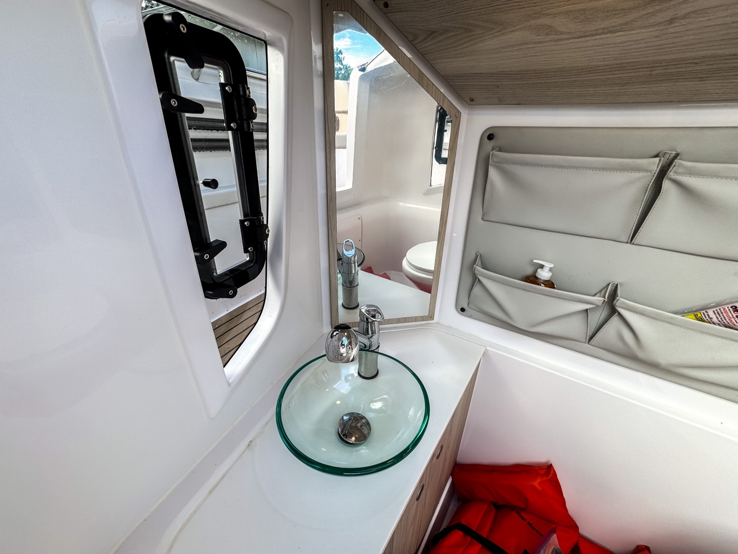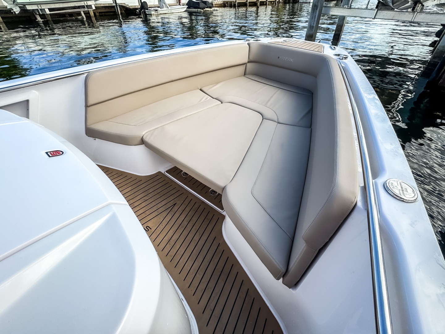 The convertible U-shaped lounge with sunbed transforms the deck into a vibrant social zone—perfect for open-air dining, entertaining, and romantic sunsets. Passenger seats with a leaning function ensure safe, enjoyable cruising. Bow and cabin storage keep everything neatly organized.