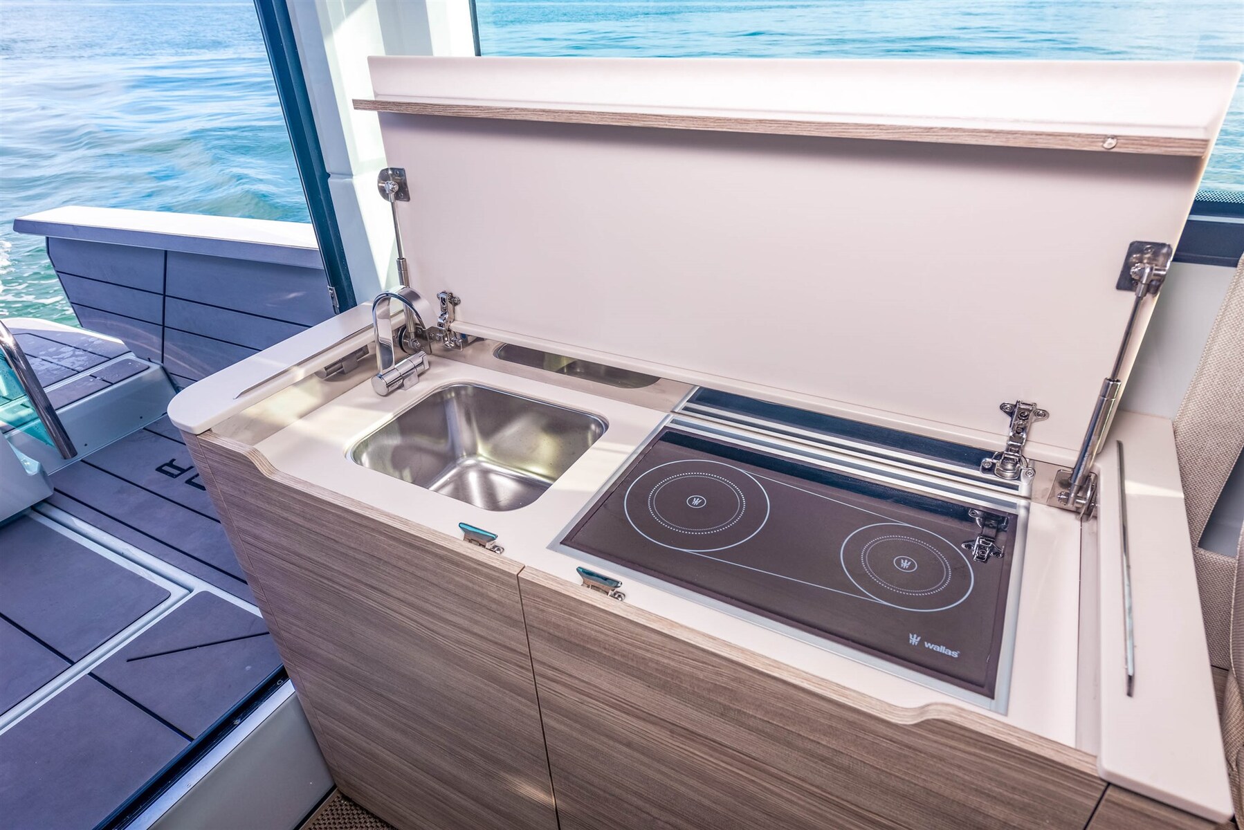 Le Saxdor 320 GTC partage le même design de coque raffiné, efficace et axé sur la performance que le modèle 320 GTO. Un centre de gravité bas, un faible poids, une proue pointue et une coque à double pas infusée sous vide créent une expérience de conduite unique dans tous les types de mers et de conditions météorologiques, partout dans le monde. Le Saxdor 320 GTC est disponible avec trois options de groupe motopropulseur Mercury, allant de 300 ch à 600 ch. Vous pouvez choisir l’option monomoteur, ou l’option bimoteur avec 2 x 225 ch ou 2 x 300 ch, le véritable « Grand Turismo de la mer ». Le Saxdor 320 GTC redéfinit l’expérience du mouvement à bord. Grâce à son concept unique d’une timonerie spacieuse et d’un accès facile à la proue, se déplacer en bateau n’a jamais été aussi facile. Saxdor croit au luxe de l’espace inutilisé. Contactez-nous pour chaque détail.