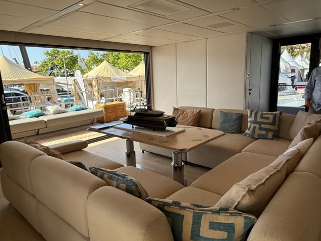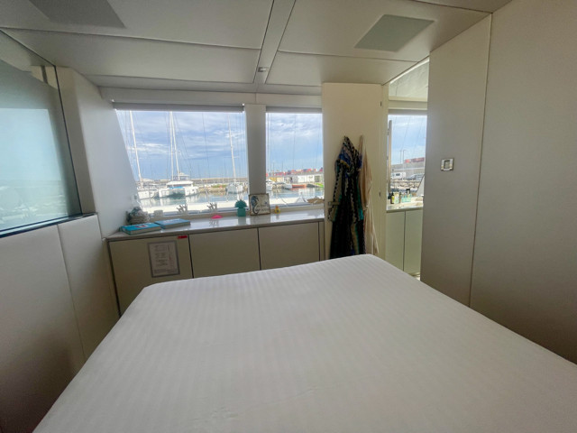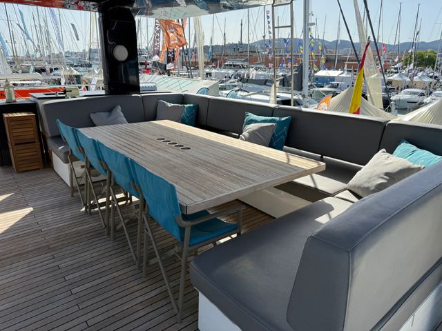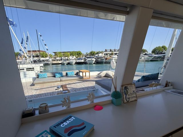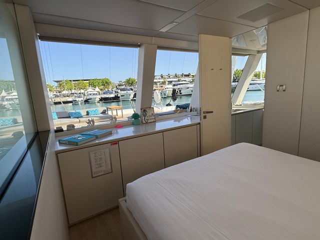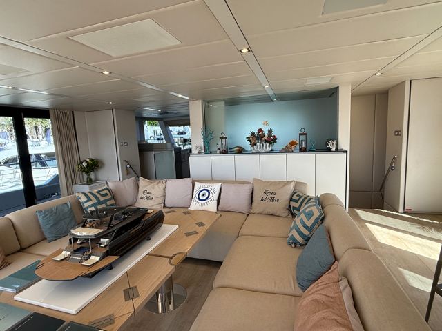 Visible uniquement sur rendez-vous dans une marina de la région de Valence, ce catamaran séduit dès les premiers instants par ses lignes contemporaines et ses espaces de vie hors normes. Son concept « Supreme » permet une circulation totalement ouverte entre intérieur et extérieur, avec un carré panoramique baigné de lumière et des zones de détente pensées pour la convivialité.