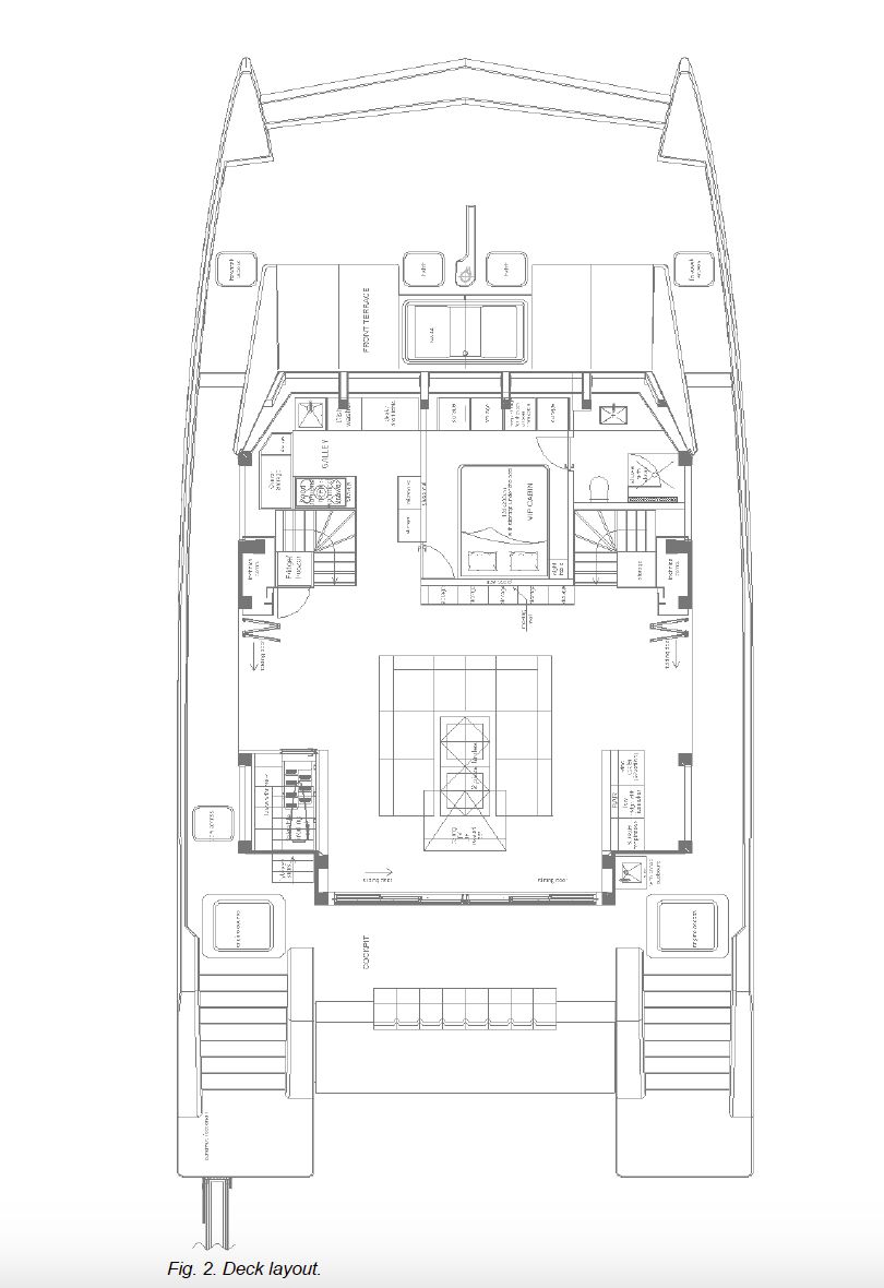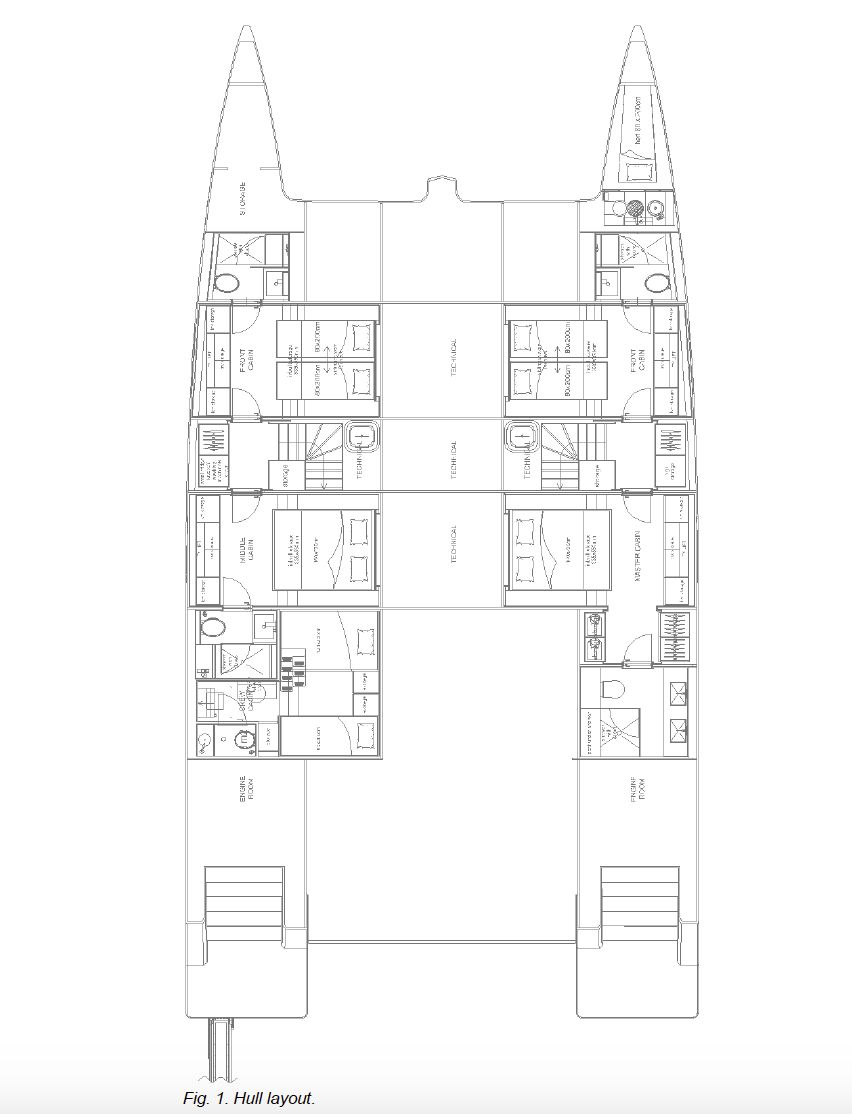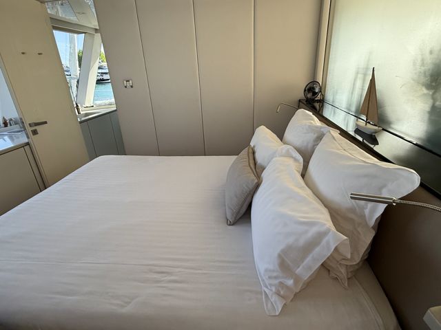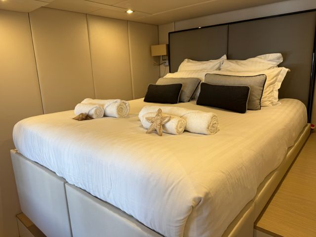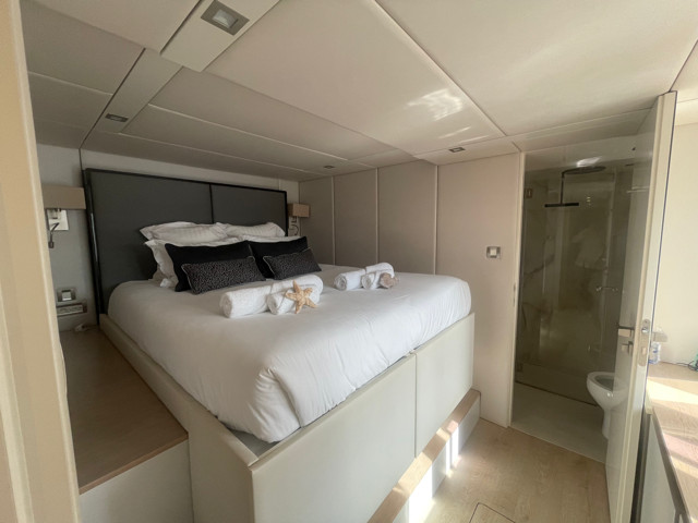 La distribución incluye cinco cabinas dobles para invitados con siete baños, además de dos cabinas de tripulación, garantizando privacidad y comodidad a bordo. El nivel de equipamiento es excepcional, con jacuzzi, cocina completamente equipada y prestaciones comparables a una villa de lujo sobre el agua.