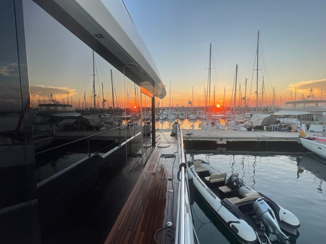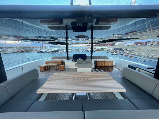 Available for viewing by appointment only in a marina in the Valencia region, this yacht stands out with her contemporary lines and unmatched living spaces. The “Supreme” concept delivers a seamless indoor-outdoor flow, with a panoramic saloon flooded with natural light and multiple relaxation areas designed for entertaining.